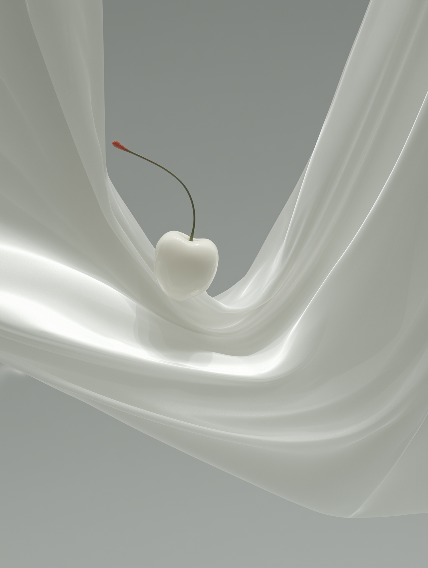 A surreal white cherry with a green stem and red tip, cradled in flowing translucent fabric against a soft gray background.