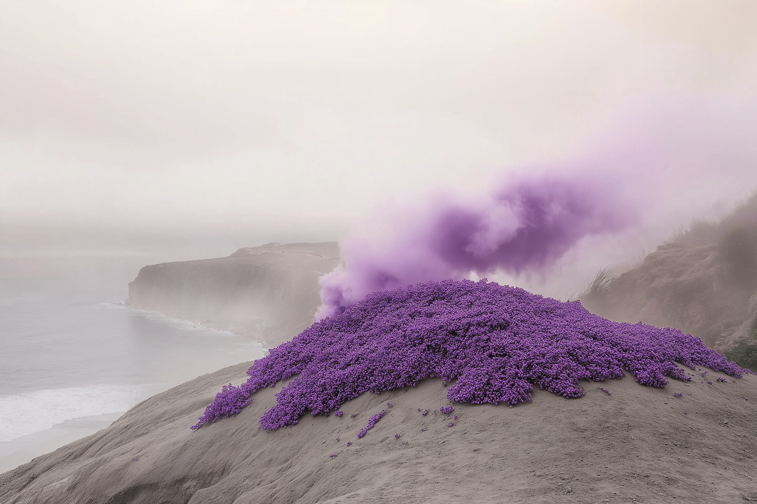 A surreal coastal scene with vibrant purple flowers emitting smoke, set against misty cliffs and a foggy ocean backdrop.