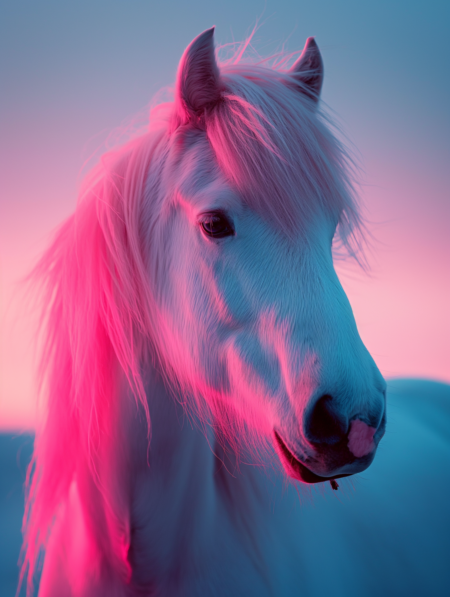 Majestic white horse illuminated by pink and blue light, creating a dreamlike and serene atmosphere.