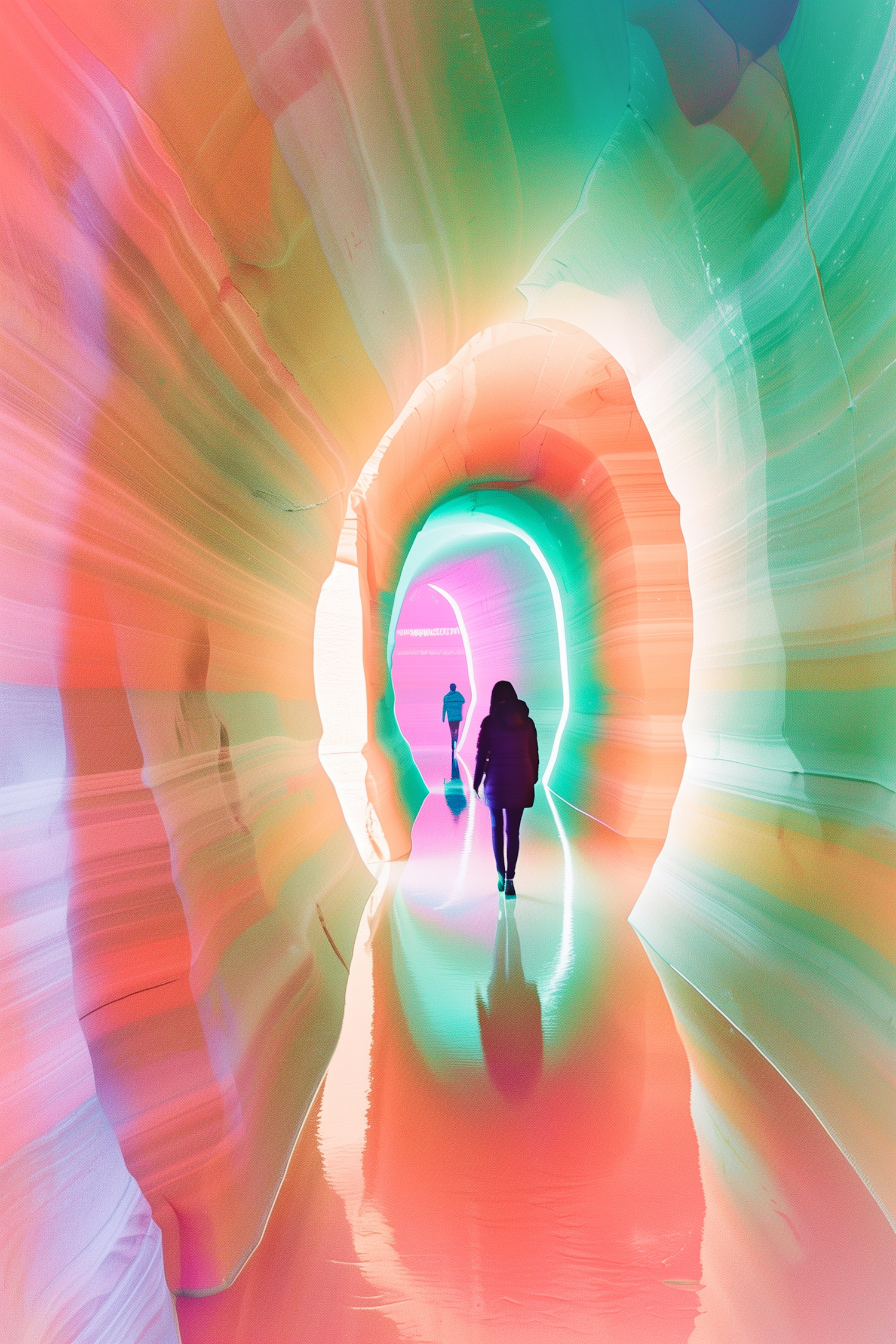 Vibrant, colorful tunnel with two silhouetted figures walking through, creating a surreal and dreamlike atmosphere.