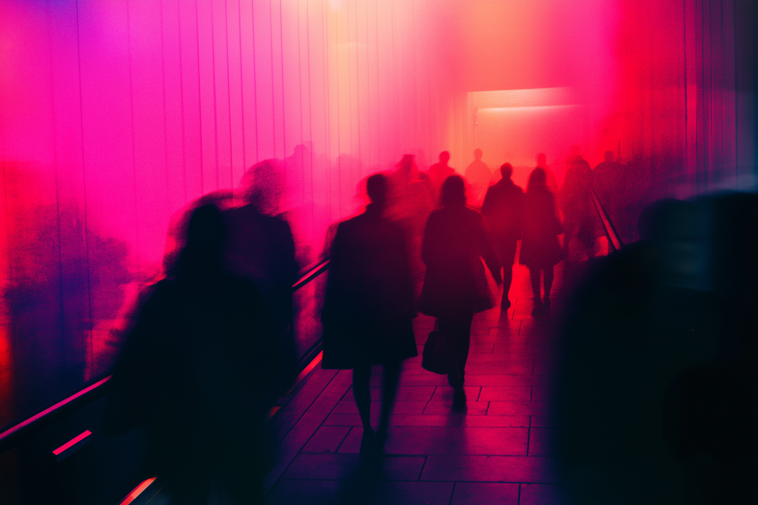 Silhouetted figures walk through a glowing pink and red corridor, creating a surreal and dreamlike atmosphere with blurred motion.
