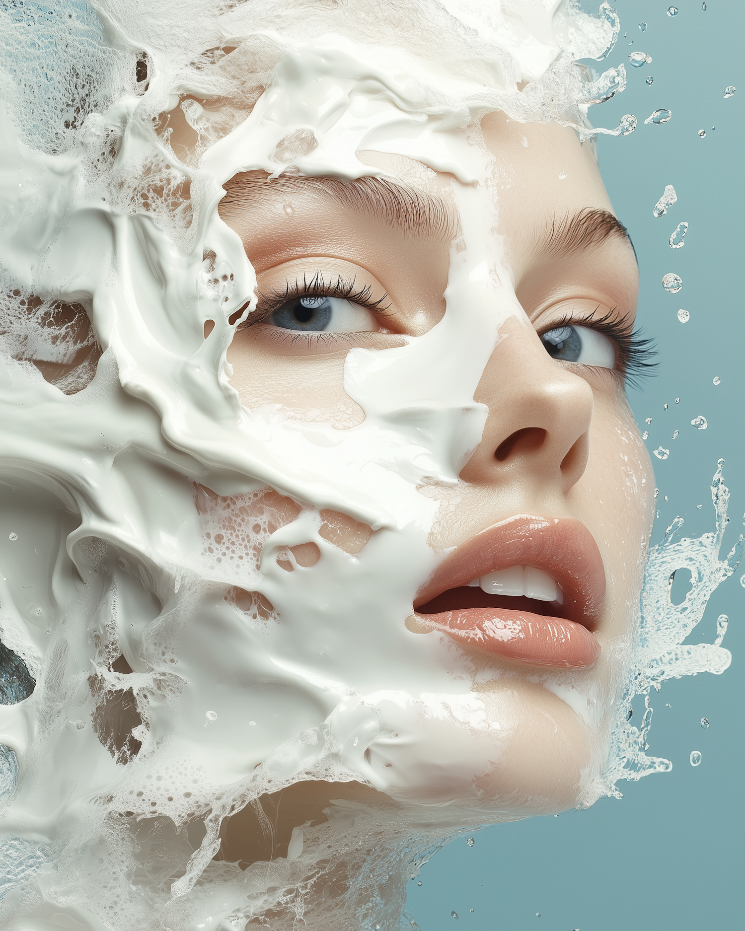 Artistic close-up of a serene woman with light blue eyes, fair skin, and glossy lips, partially covered in flowing white foam.