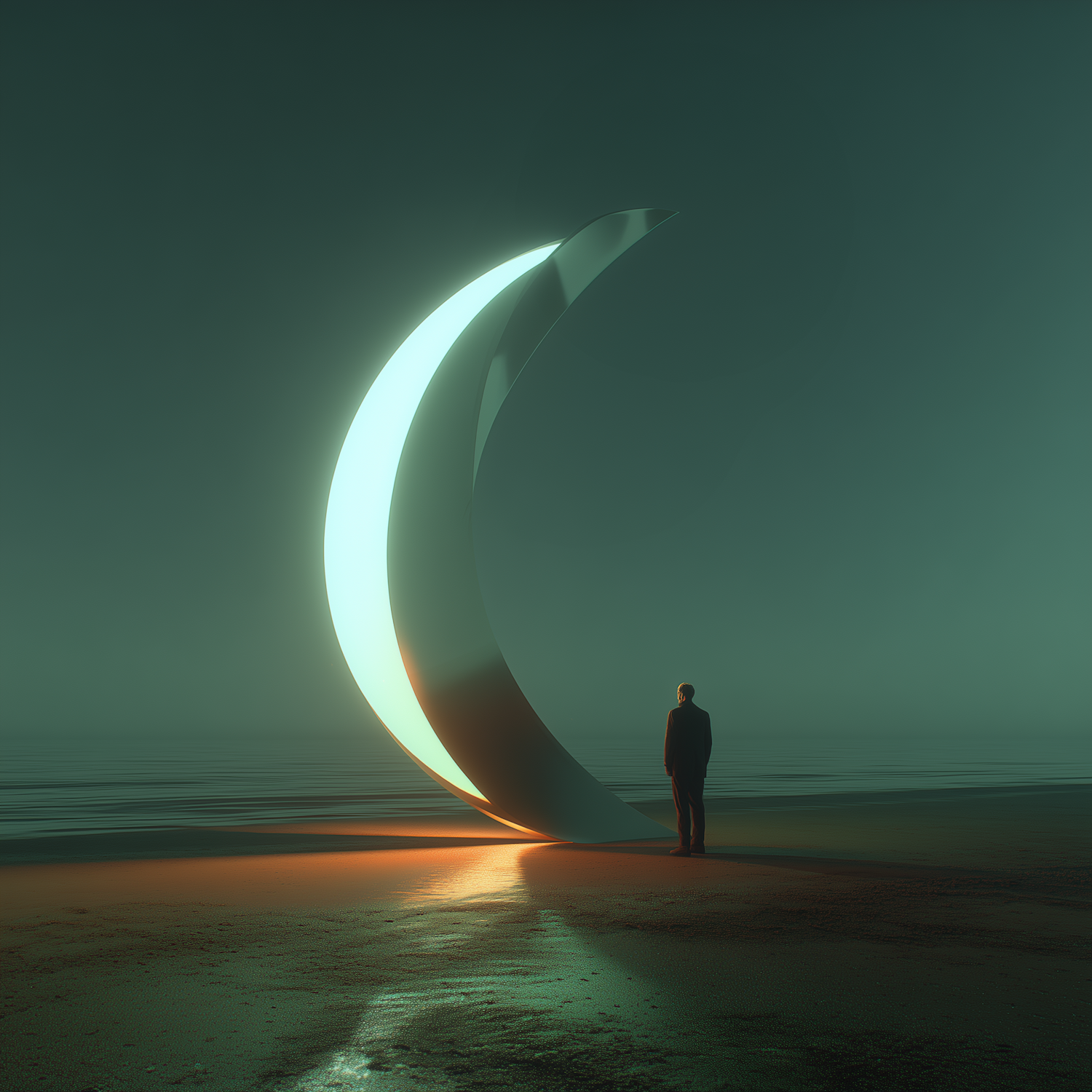 A surreal glowing crescent sculpture on a beach, with a lone figure observing under a dreamy teal sky.