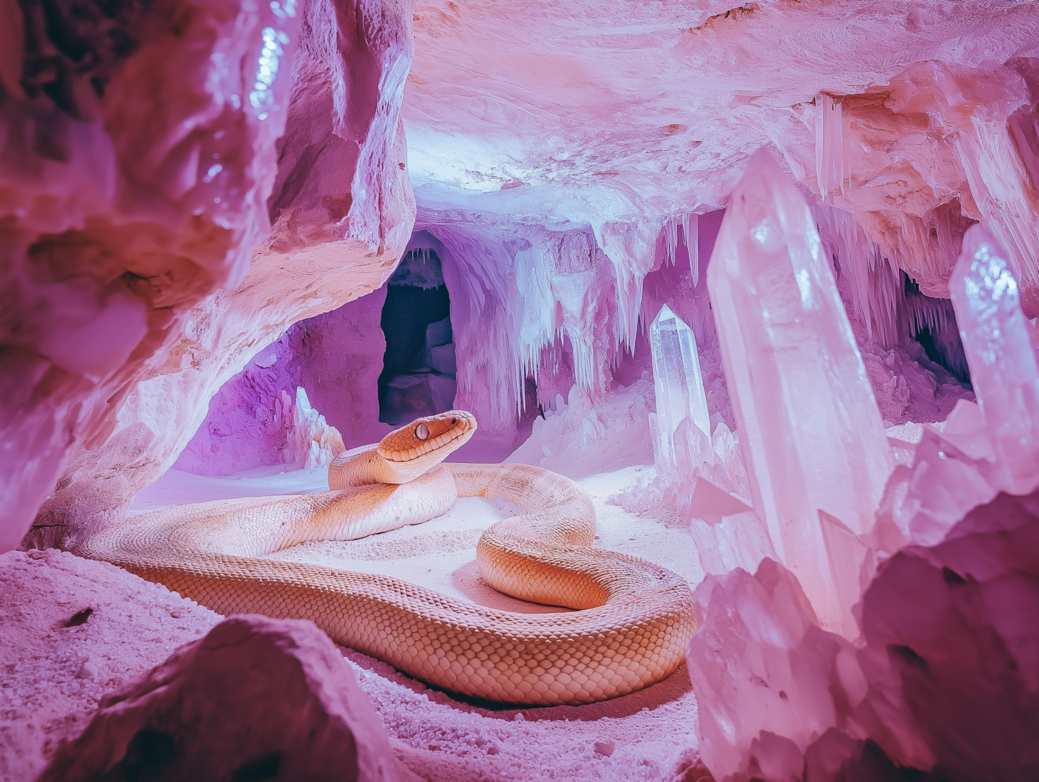 A pale yellow snake rests in a crystal-filled cave, illuminated by ethereal pink and purple light, creating a mystical atmosphere.