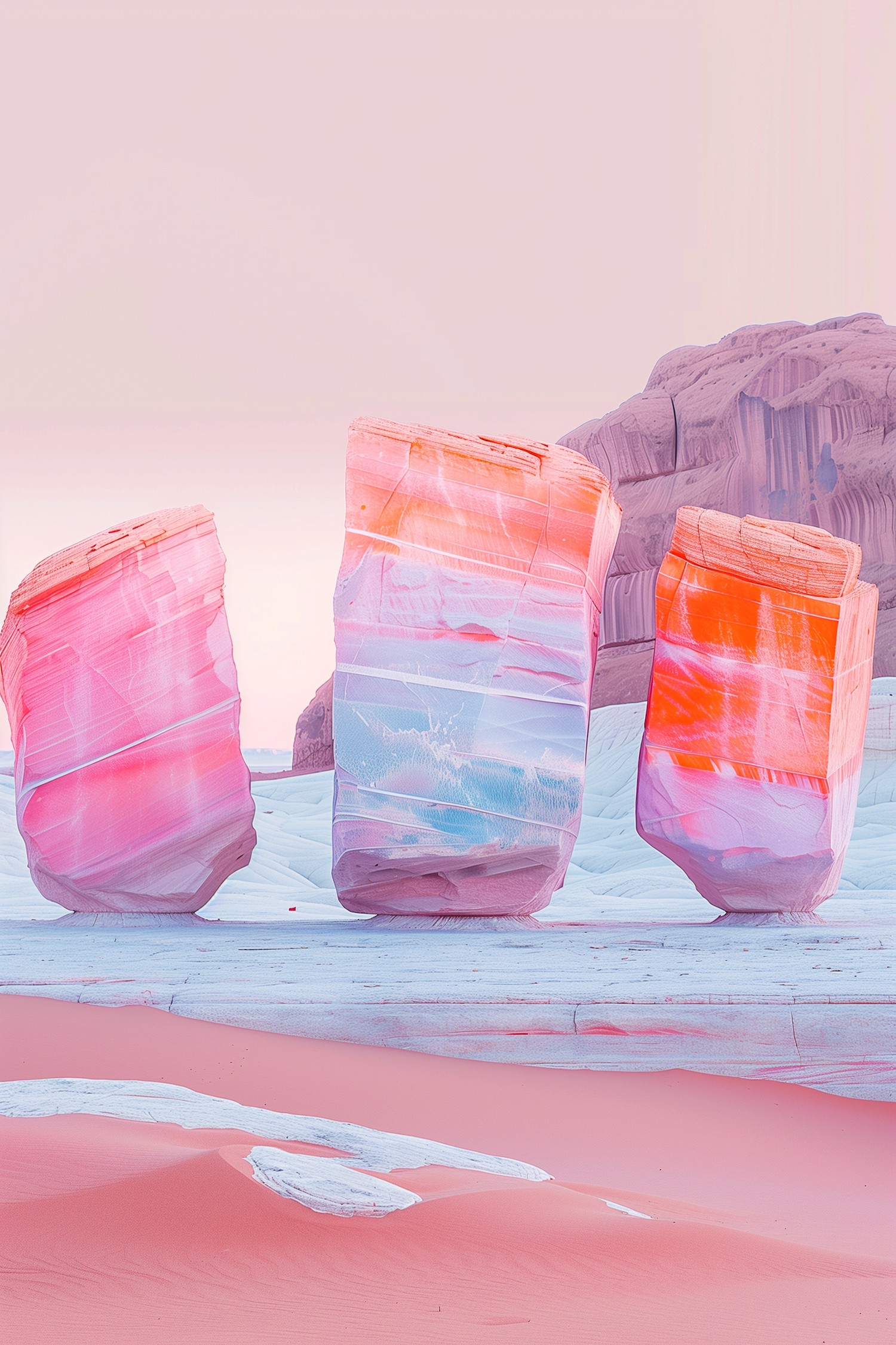 Surreal rock formations in vibrant pink, orange, and blue hues against a pastel landscape, creating a dreamlike and ethereal scene.