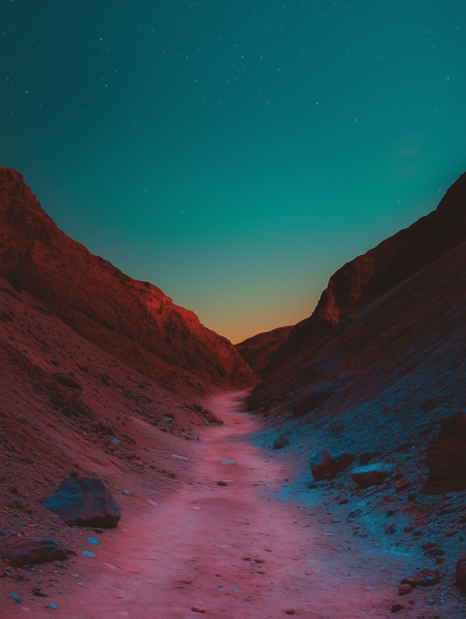 A vibrant desert canyon at twilight with a pink and blue illuminated path, rugged red walls, and a starry teal sky fading to orange.