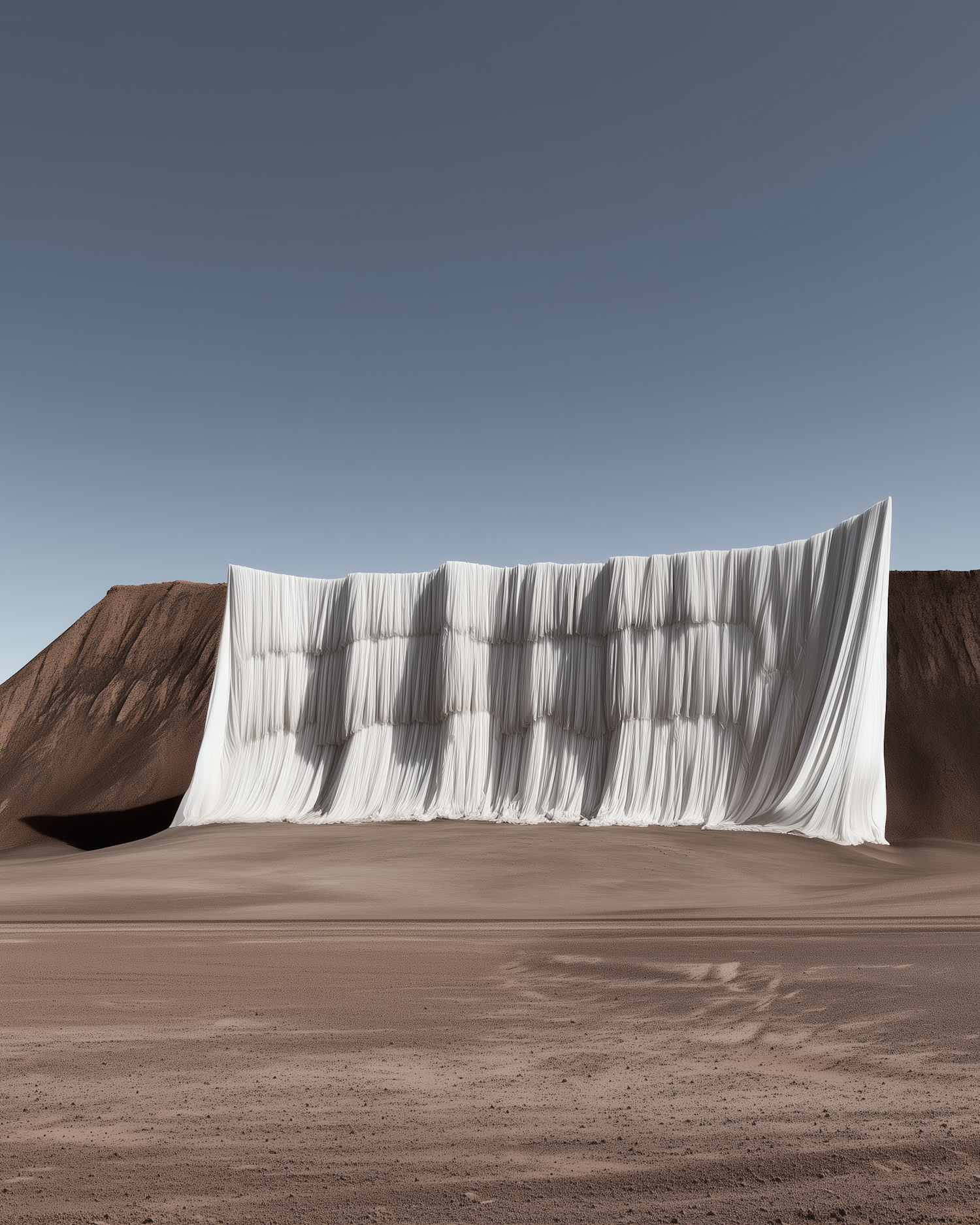 A surreal desert scene with a large white fabric draped across a barren landscape, contrasting with the earthy tones and clear blue sky.