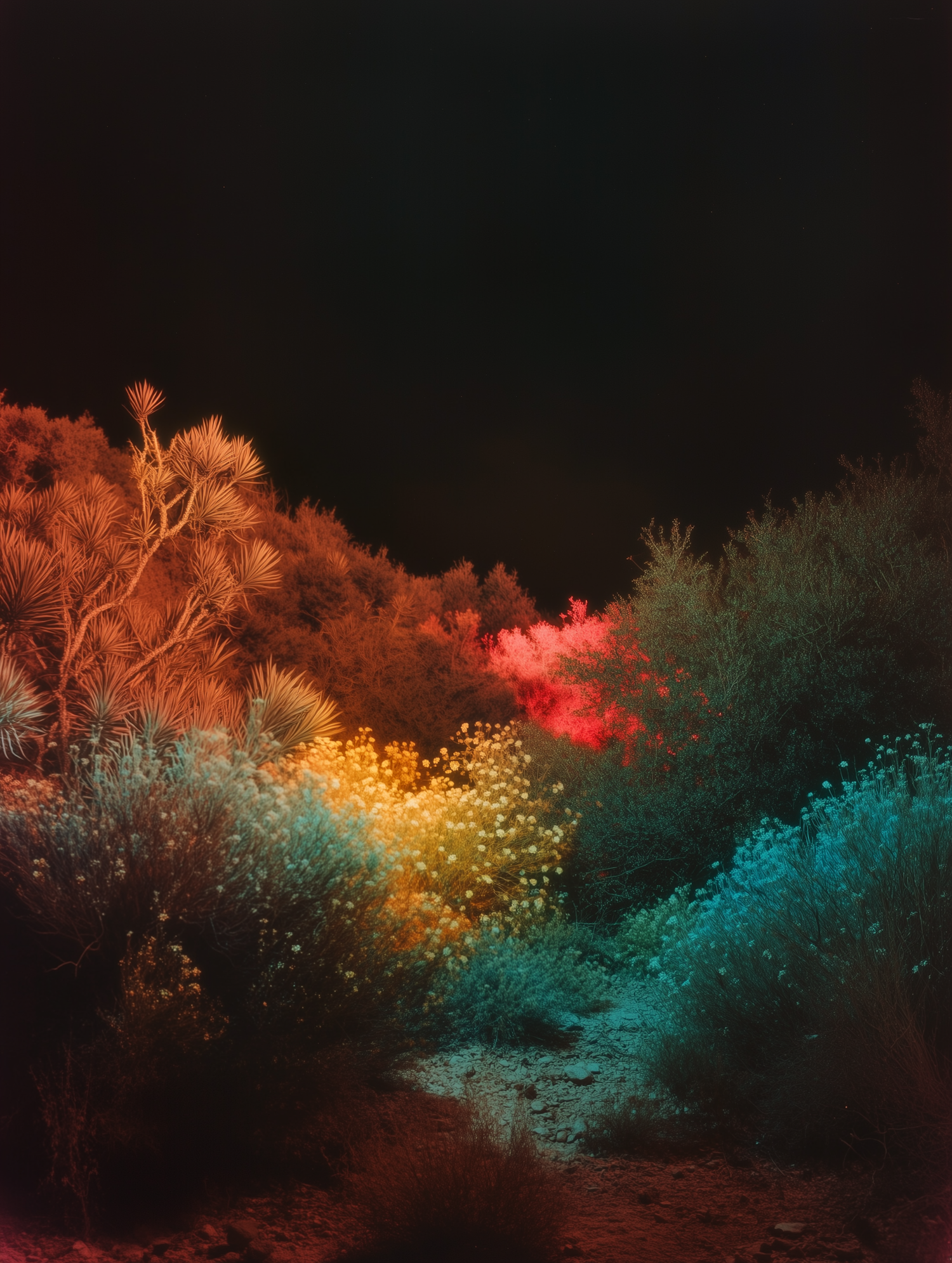 A vibrant desert scene with glowing plants in red, orange, yellow, and blue hues under a dark sky, creating a surreal and dreamlike atmosphere.