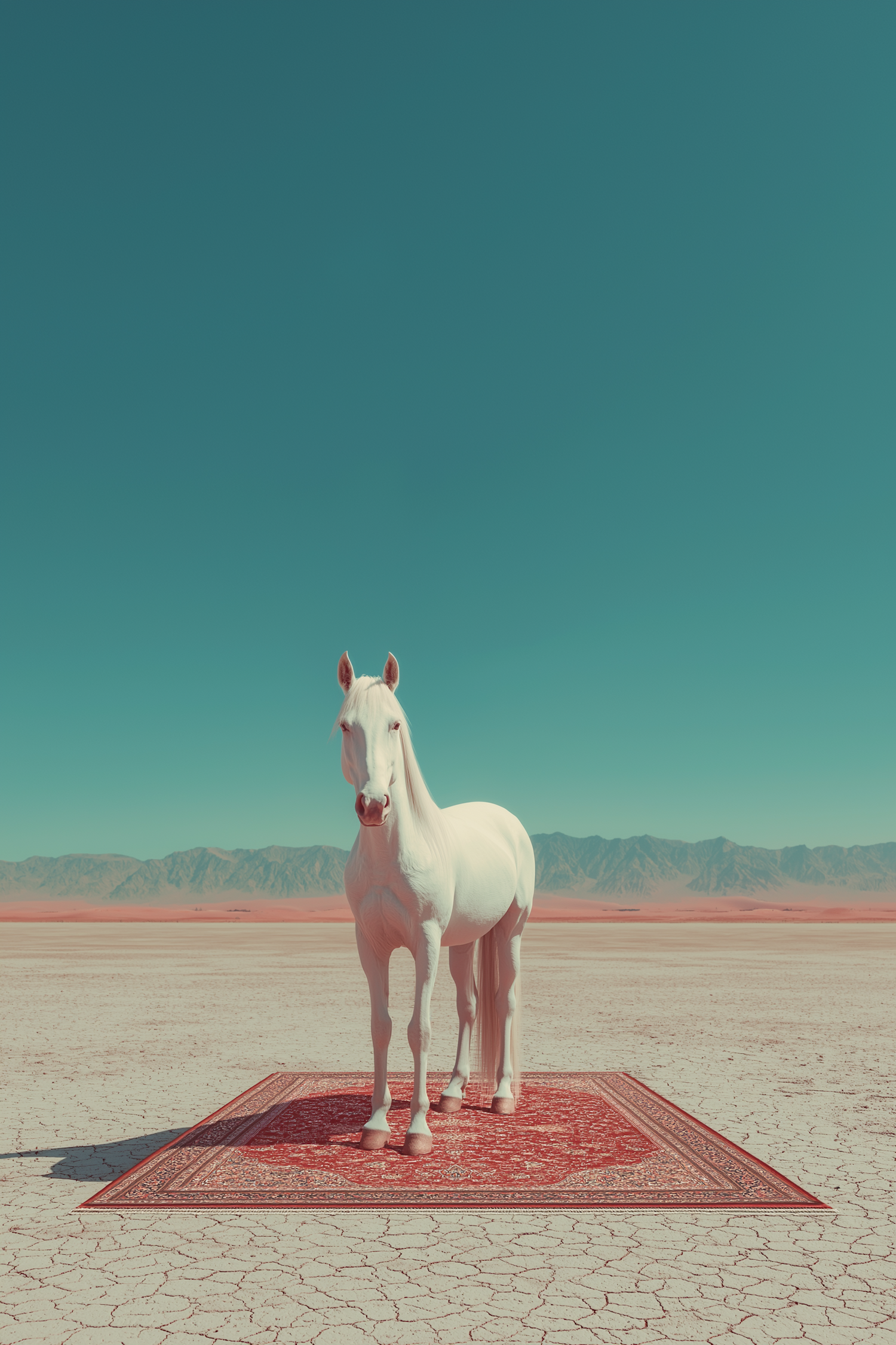 A white horse stands on a red carpet in a cracked desert, with mountains in the distance and a clear blue sky above.