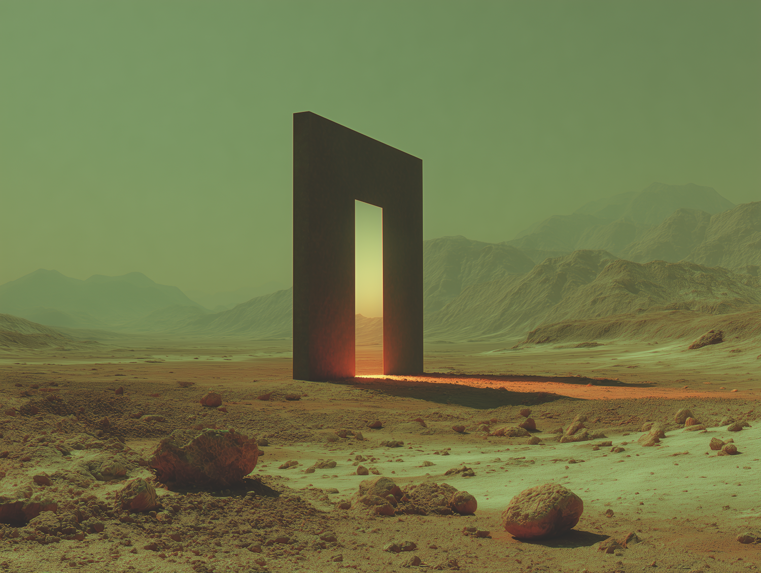 A surreal desert scene with a glowing monolith, green sky, and distant mountains, creating a mysterious and otherworldly atmosphere.