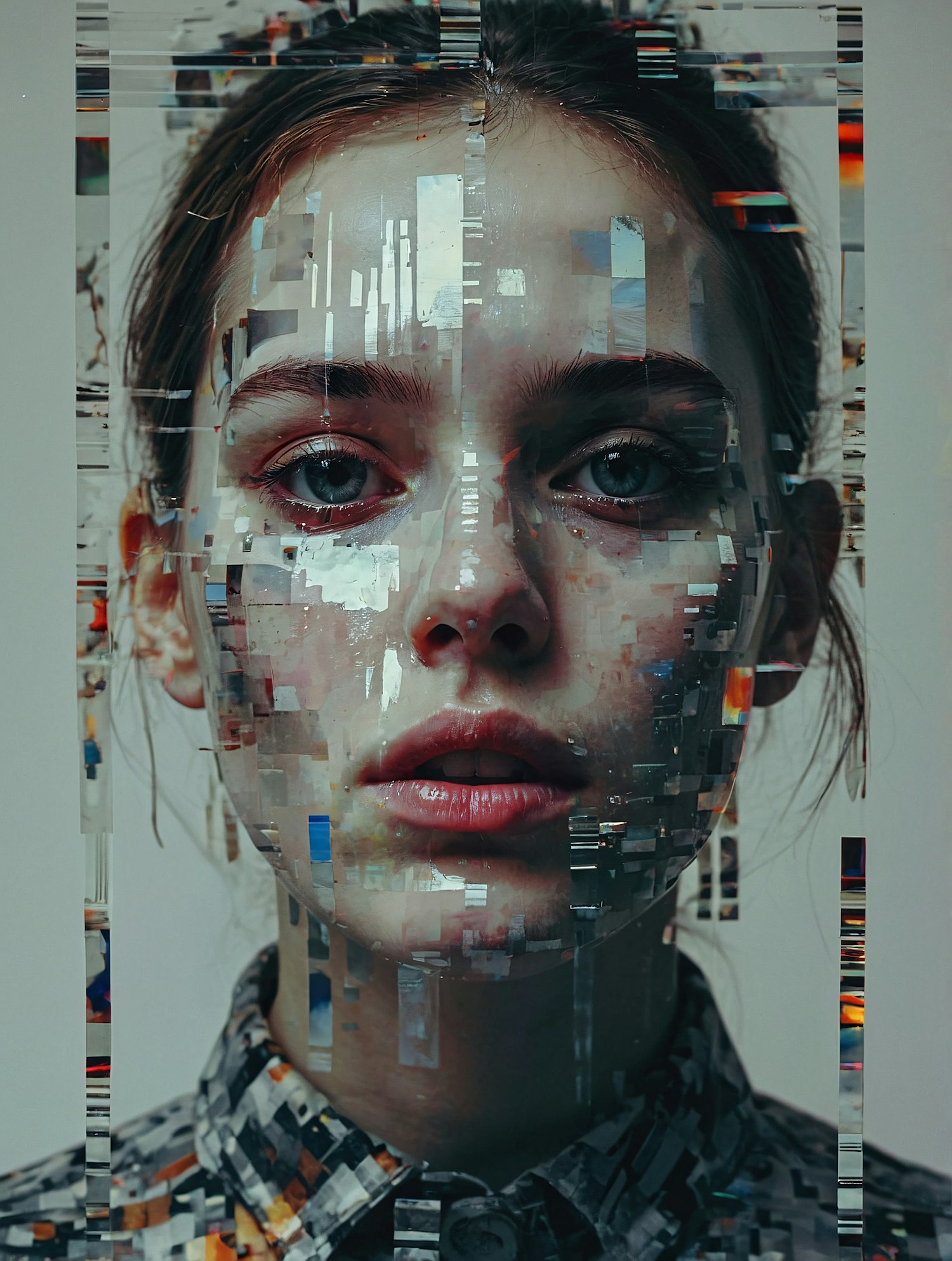 A surreal portrait of a young woman with glitch-like digital overlays on her face, blending human emotion with futuristic aesthetics.