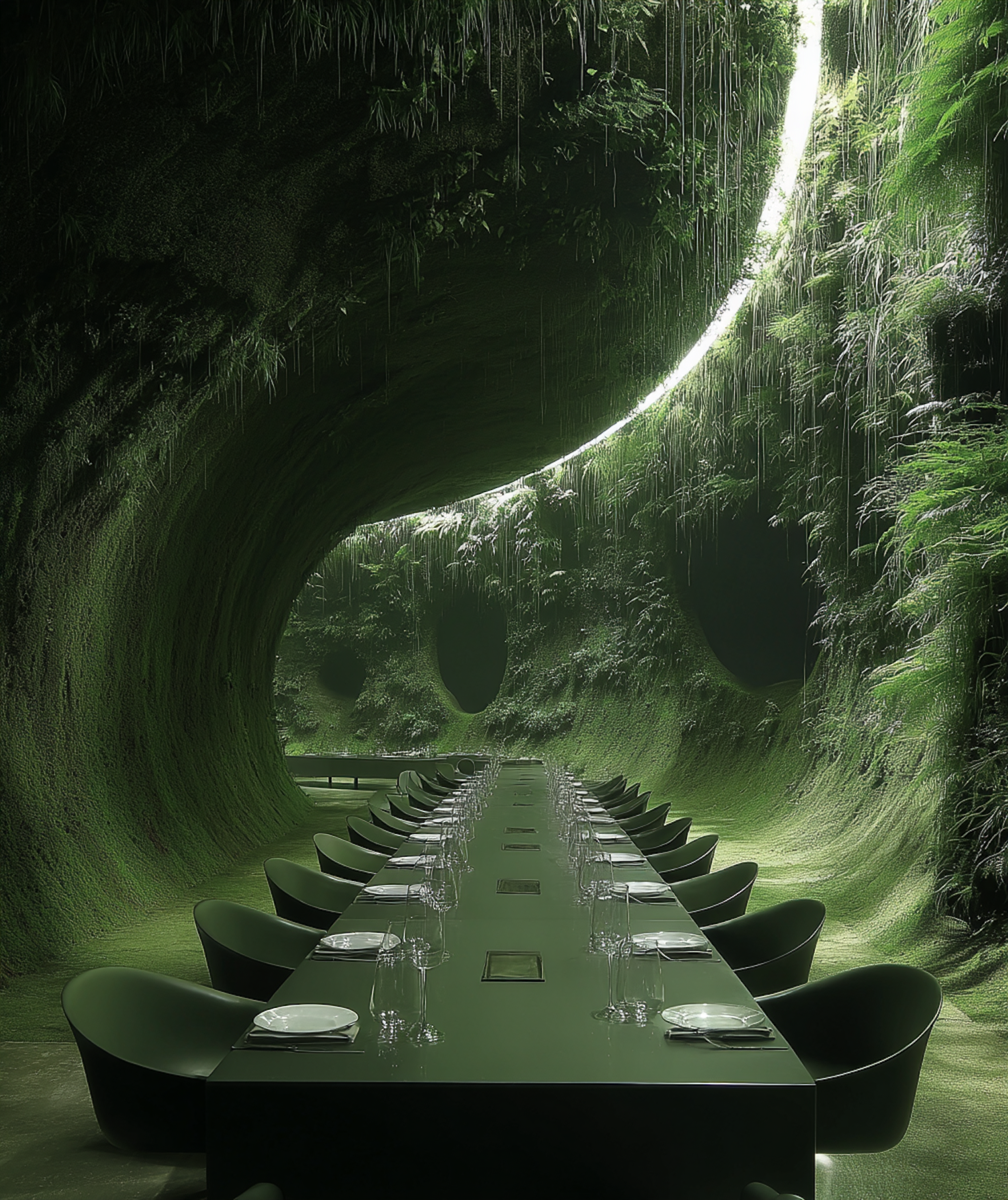 A modern dining table set in a lush, green cave-like environment with moss-covered walls and natural light streaming in.