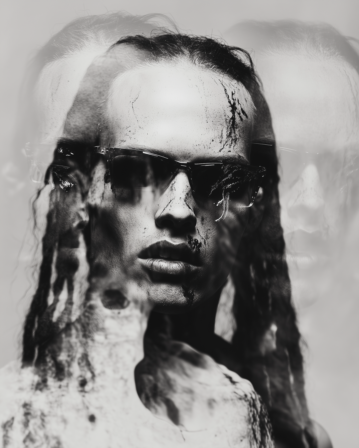 Surreal black-and-white portrait with double exposure, sunglasses, and textured details, creating a haunting and mysterious vibe.