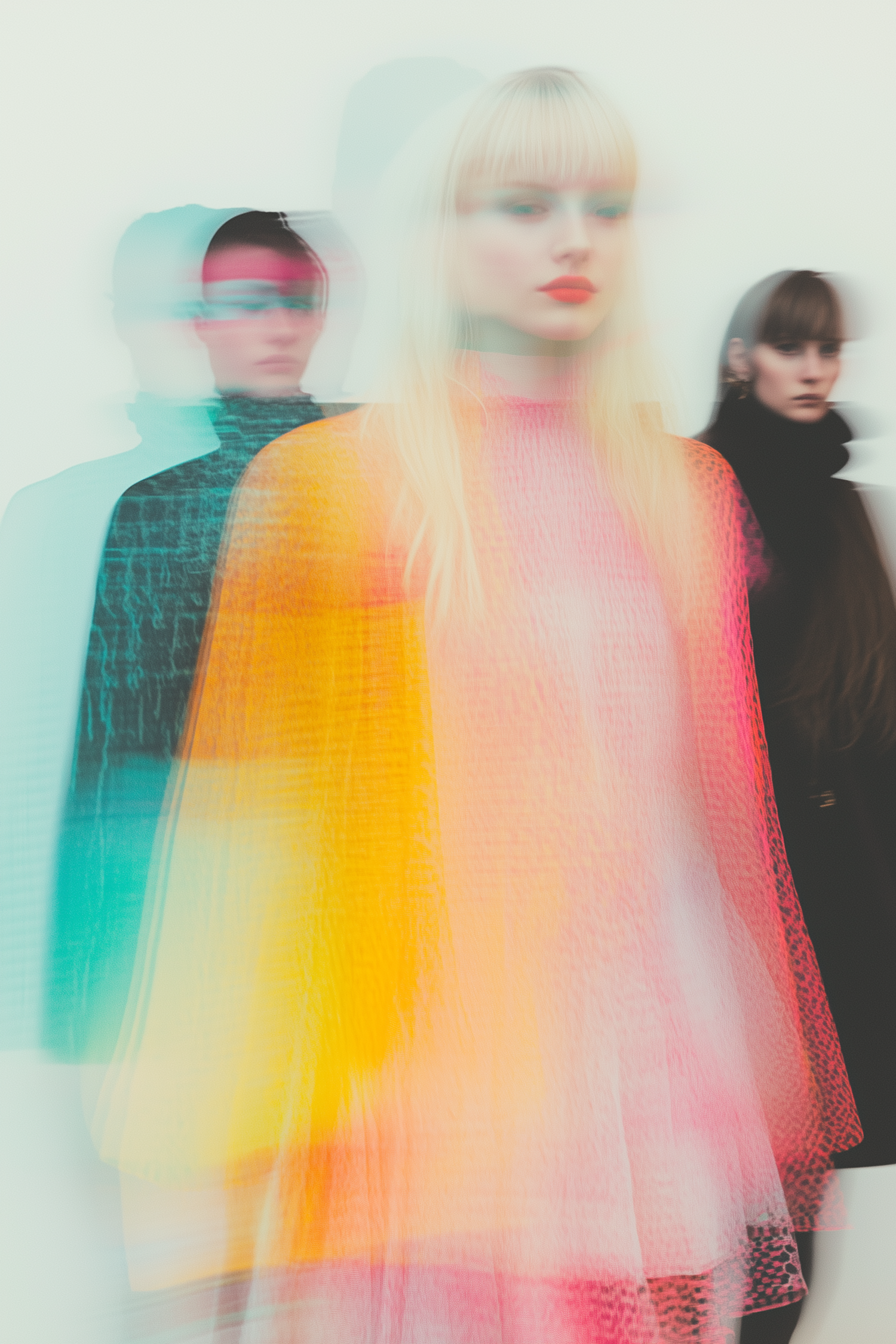 A dreamy, blurred portrait of three individuals with vibrant colors and a surreal double-exposure effect.
