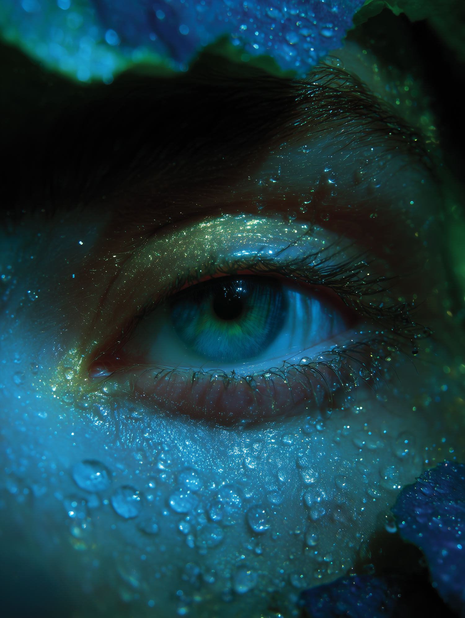 A mesmerizing close-up of a green eye surrounded by water droplets, illuminated with ethereal blue-green light for a surreal effect.