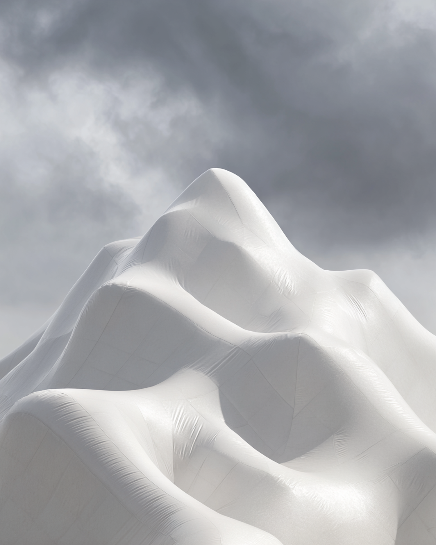 A surreal white fabric-like mountain structure under a cloudy sky, showcasing smooth curves and dramatic lighting.