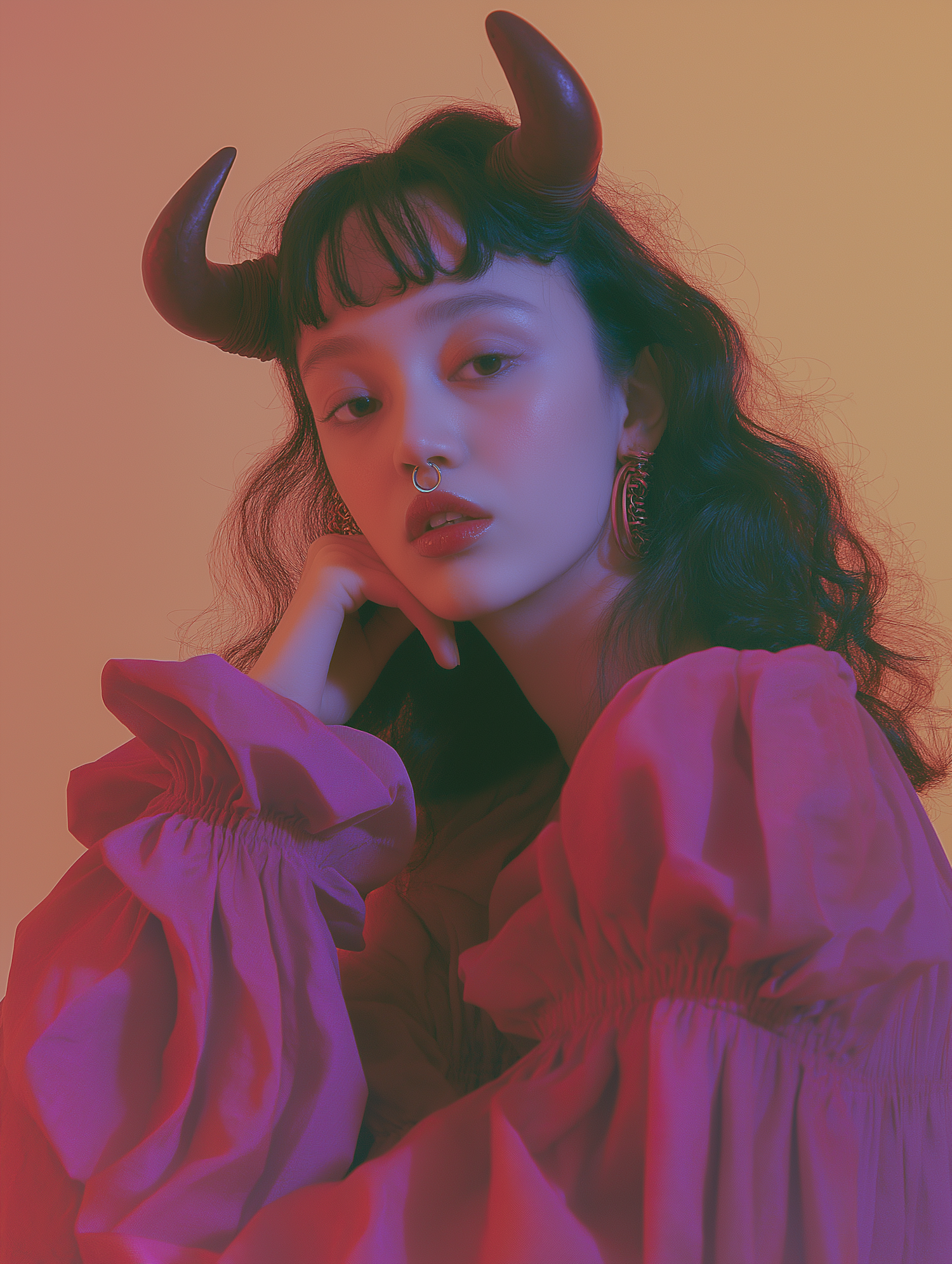 Portrait of a young woman with horns, wearing a red blouse and nose ring, set against a warm gradient background.