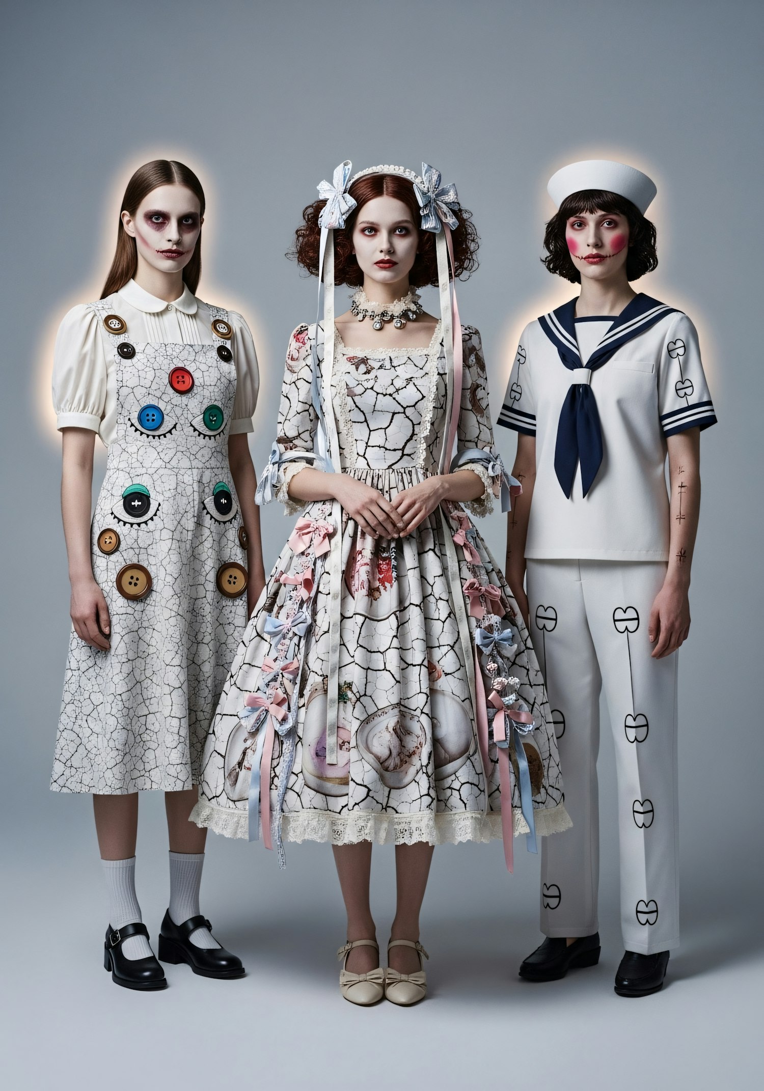 Three individuals in artistic, surreal outfits with cracked porcelain patterns and dramatic makeup, set against a neutral background.