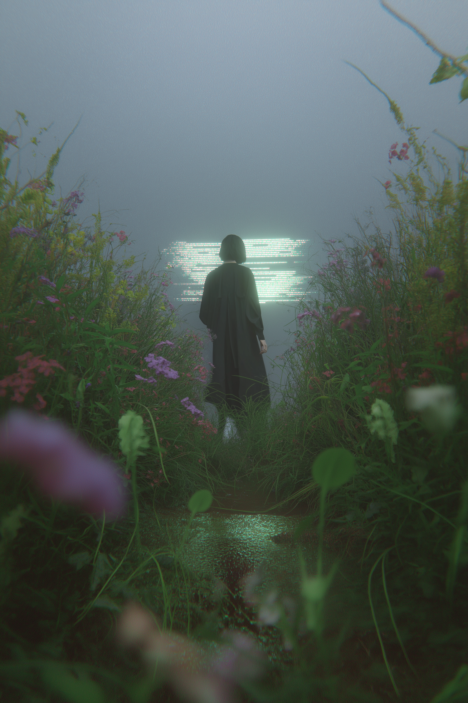 A mysterious figure in a dark cloak stands in a misty field of wildflowers, facing a glowing, glitch-like light in the distance.
