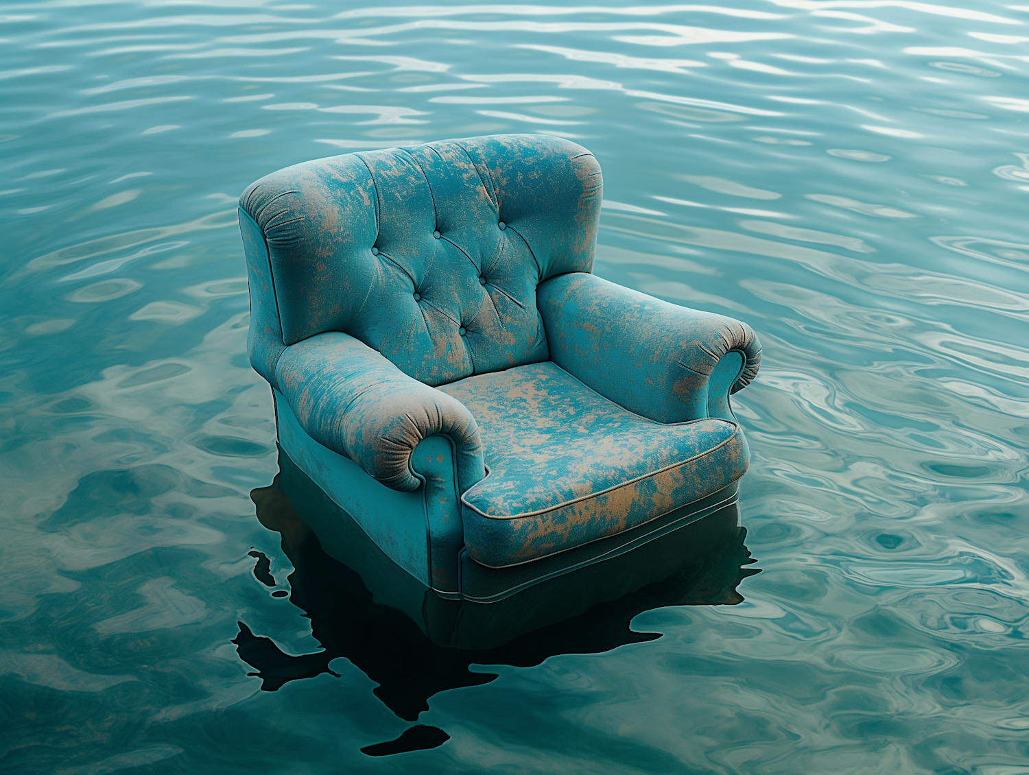 A vintage teal armchair floats on calm water, creating a surreal and tranquil scene with gentle ripples and soft reflections.