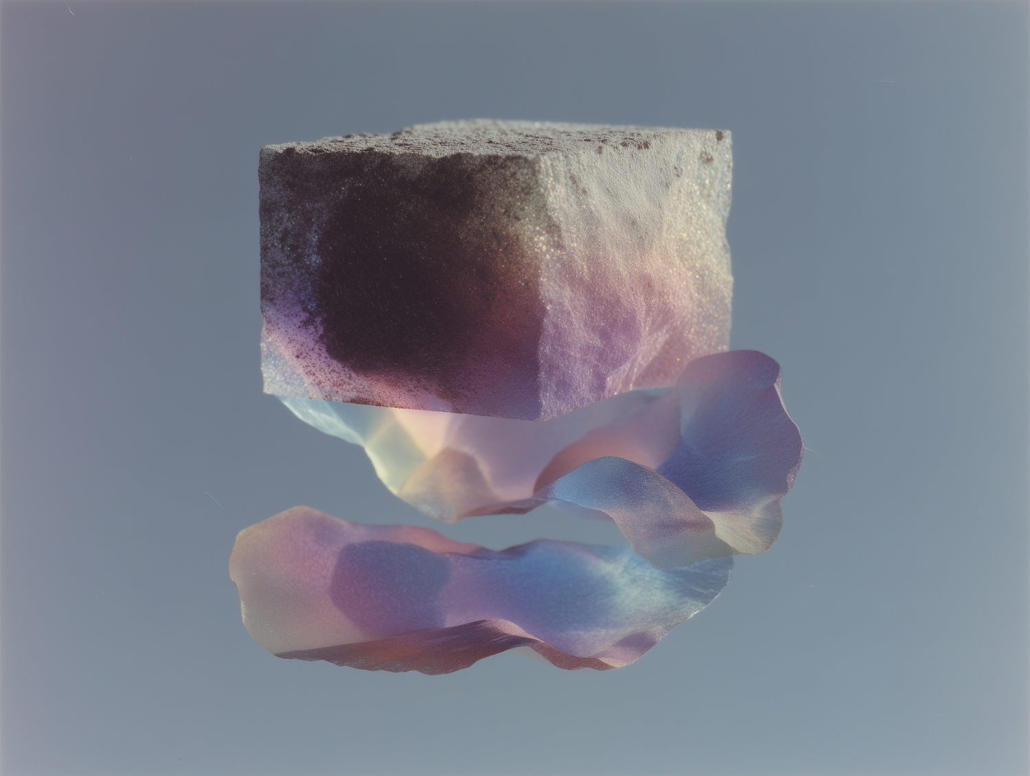 A textured cube and iridescent ribbon float in a surreal, light blue space, creating a dreamlike and abstract visual composition.