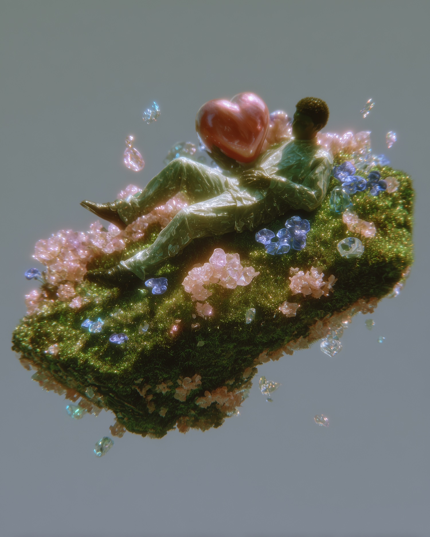A surreal 3D artwork of a figure on a mossy floating island with crystals, holding a glossy heart, set against a neutral background.