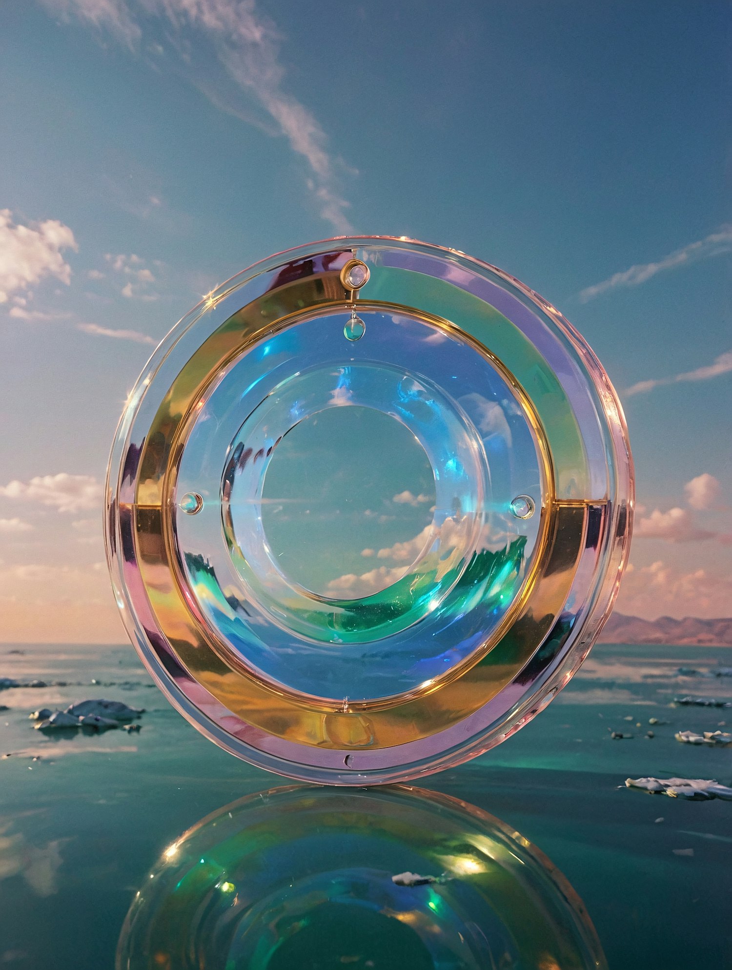 A stunning iridescent circular object floats over a reflective water surface under a dreamy sky with clouds and distant mountains.