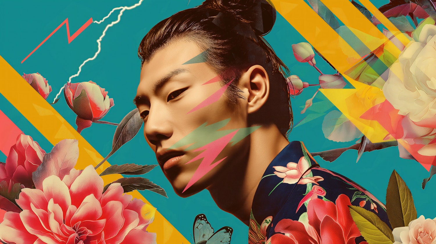 Vibrant illustration of an Asian man with floral patterns and abstract shapes on a teal background, blending traditional and modern art.