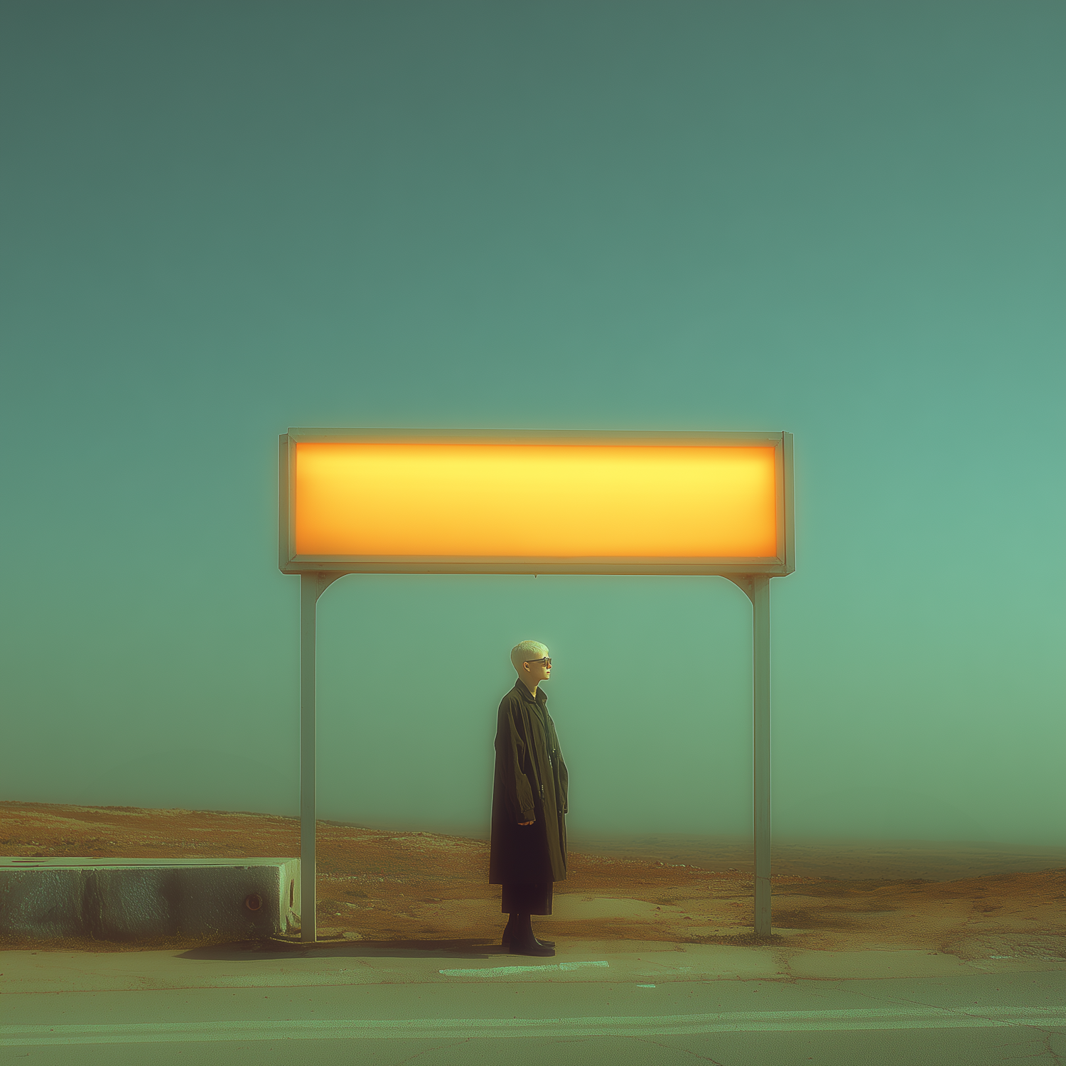 A person in a long coat stands under a glowing yellow sign in a foggy, desolate landscape, creating a surreal and mysterious atmosphere.
