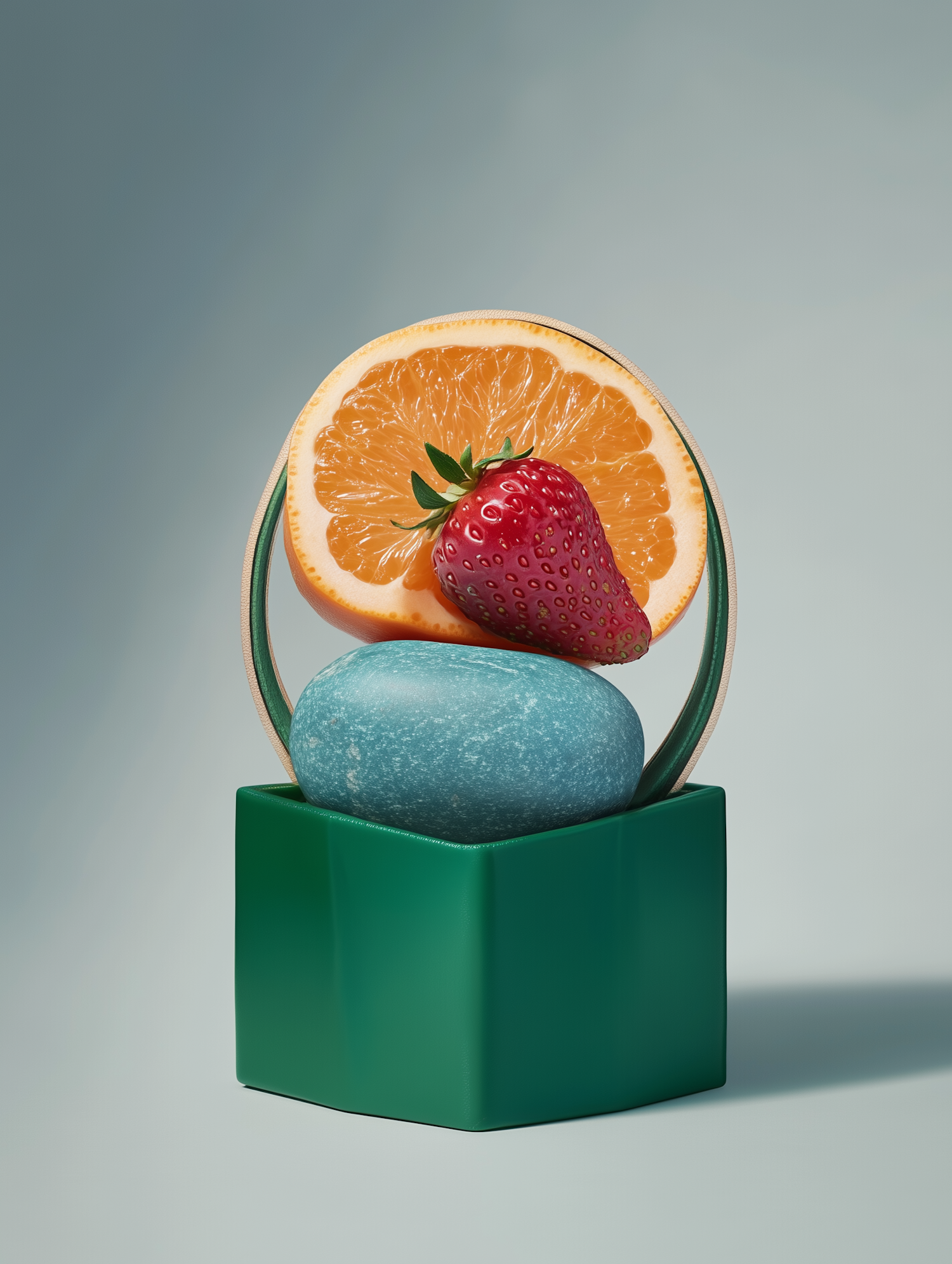 Artistic arrangement of an orange slice, strawberry, and blue stone on a green base with a soft blue background.