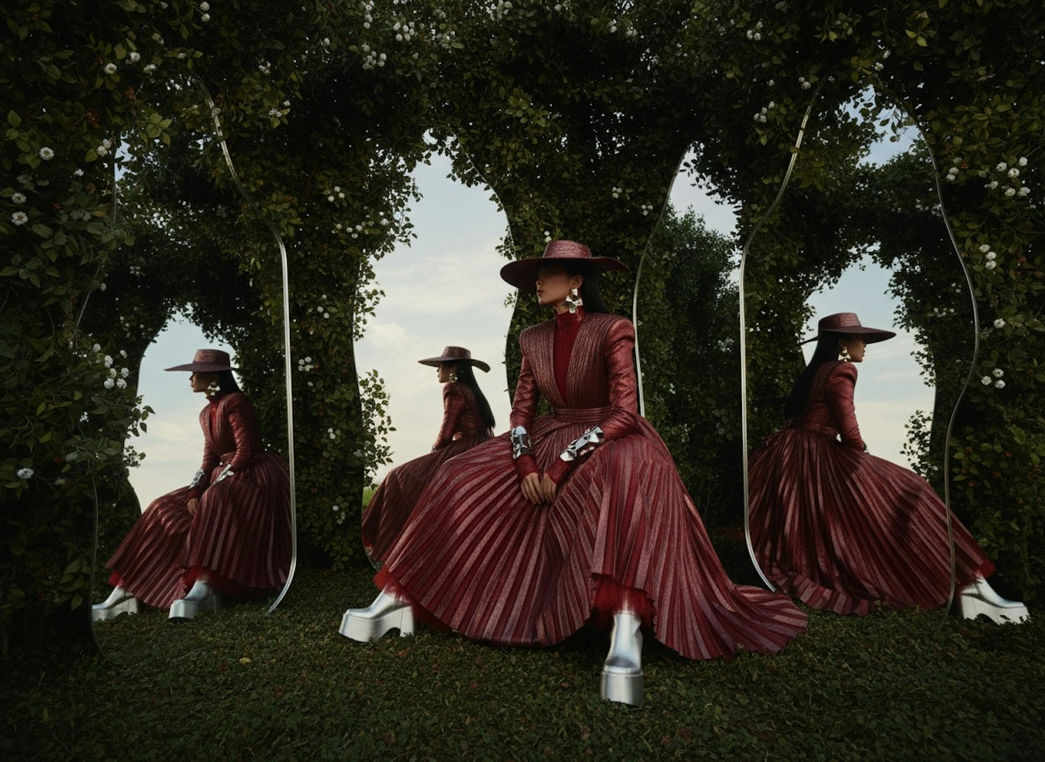 A surreal garden scene with a woman in a metallic red gown and hat, surrounded by mirrors reflecting her image, creating a unique visual effect.