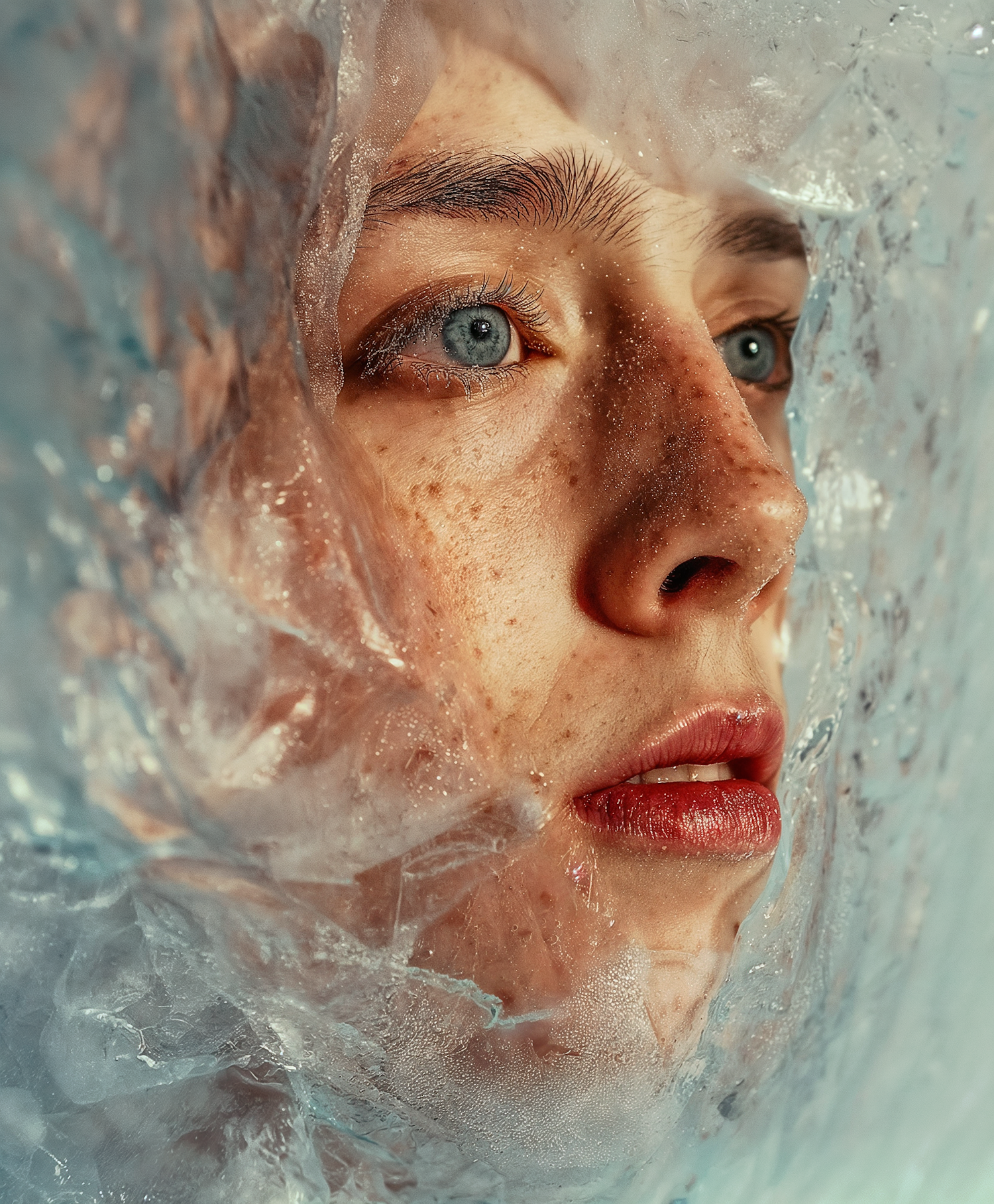 Close-up of a freckled face with blue eyes, partially submerged in ice, creating a surreal and ethereal visual effect.