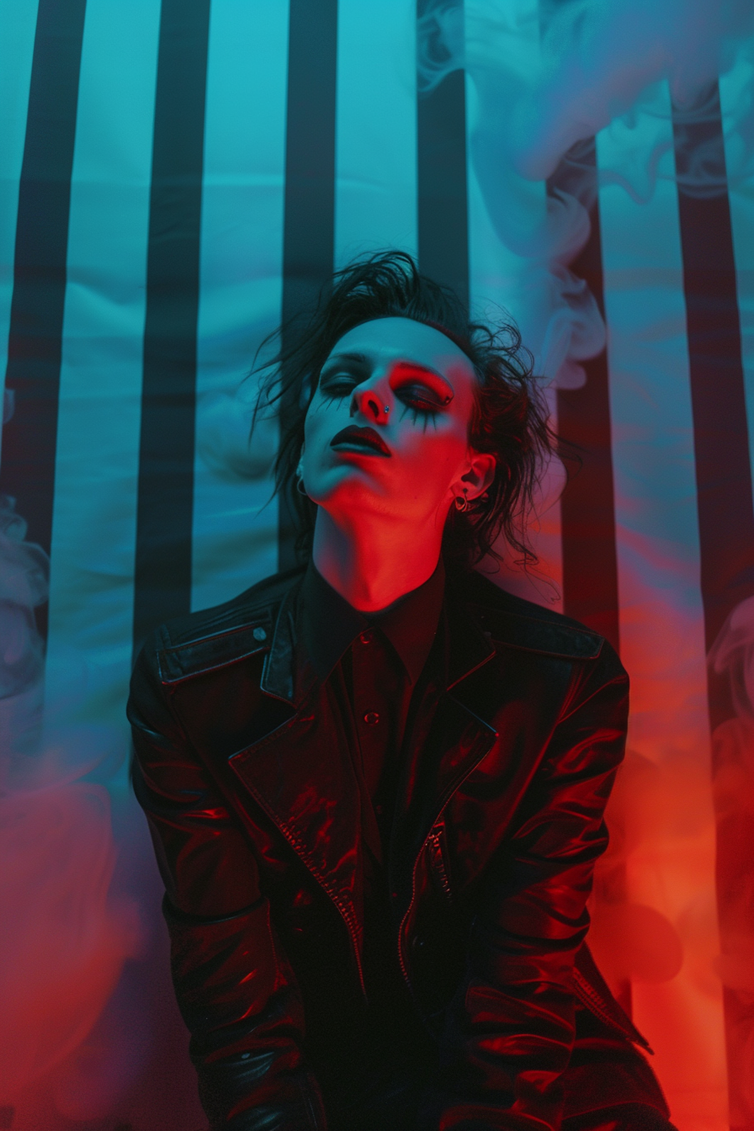 Gothic style portrait with dramatic lighting, featuring a person in a leather jacket, dark makeup, and smoke effects.