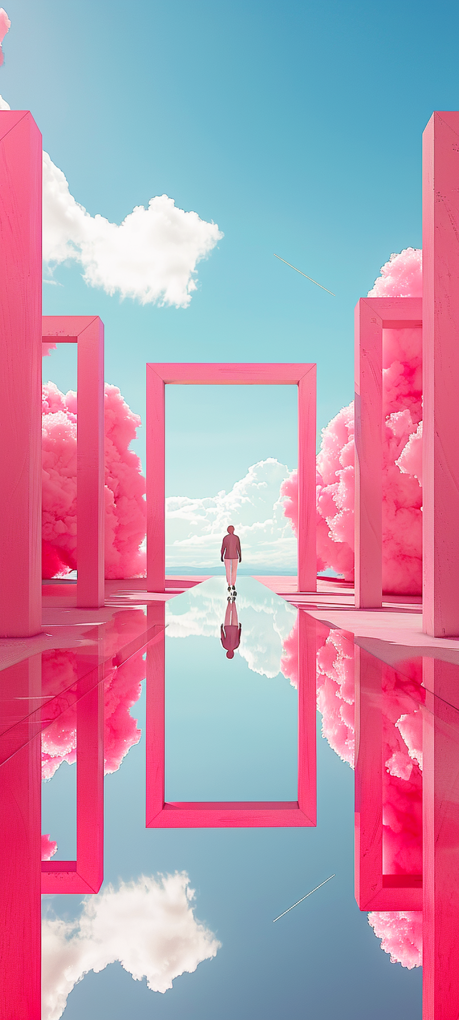 Surreal scene with pink frames, fluffy clouds, and a reflective surface. A person walks towards a large frame under a bright blue sky.