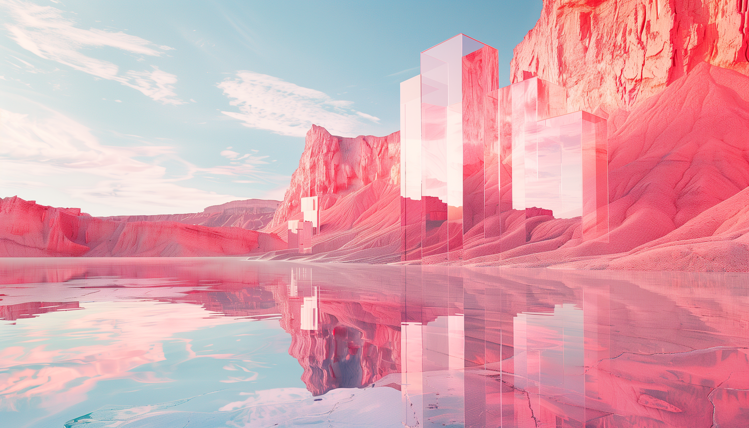 Surreal pink desert with towering glass structures reflecting a pastel sky, creating a dreamlike, futuristic landscape.