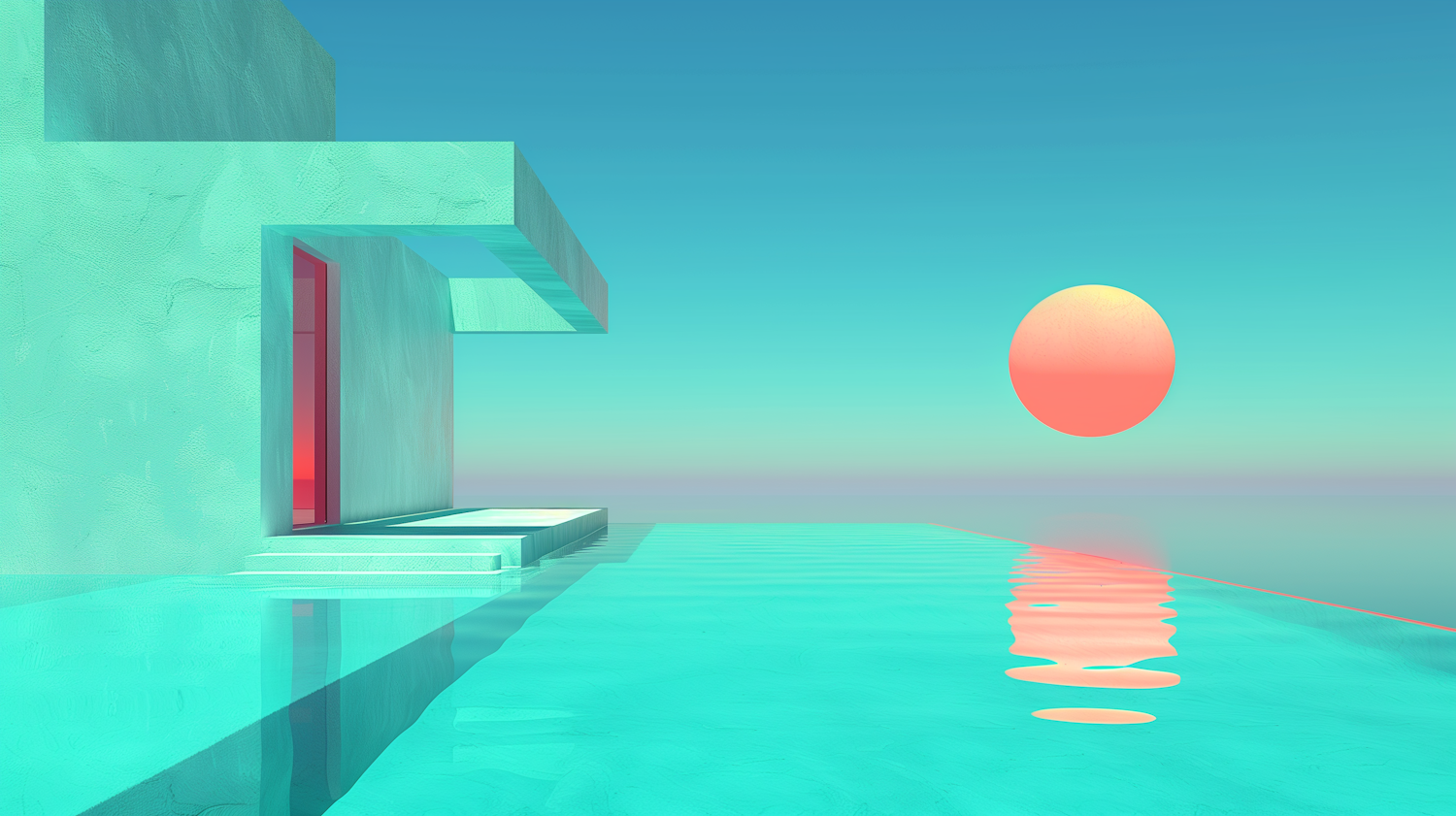 Surreal minimalist architecture with turquoise hues, reflecting water, and a glowing pink-orange sun in a serene, dreamlike setting.