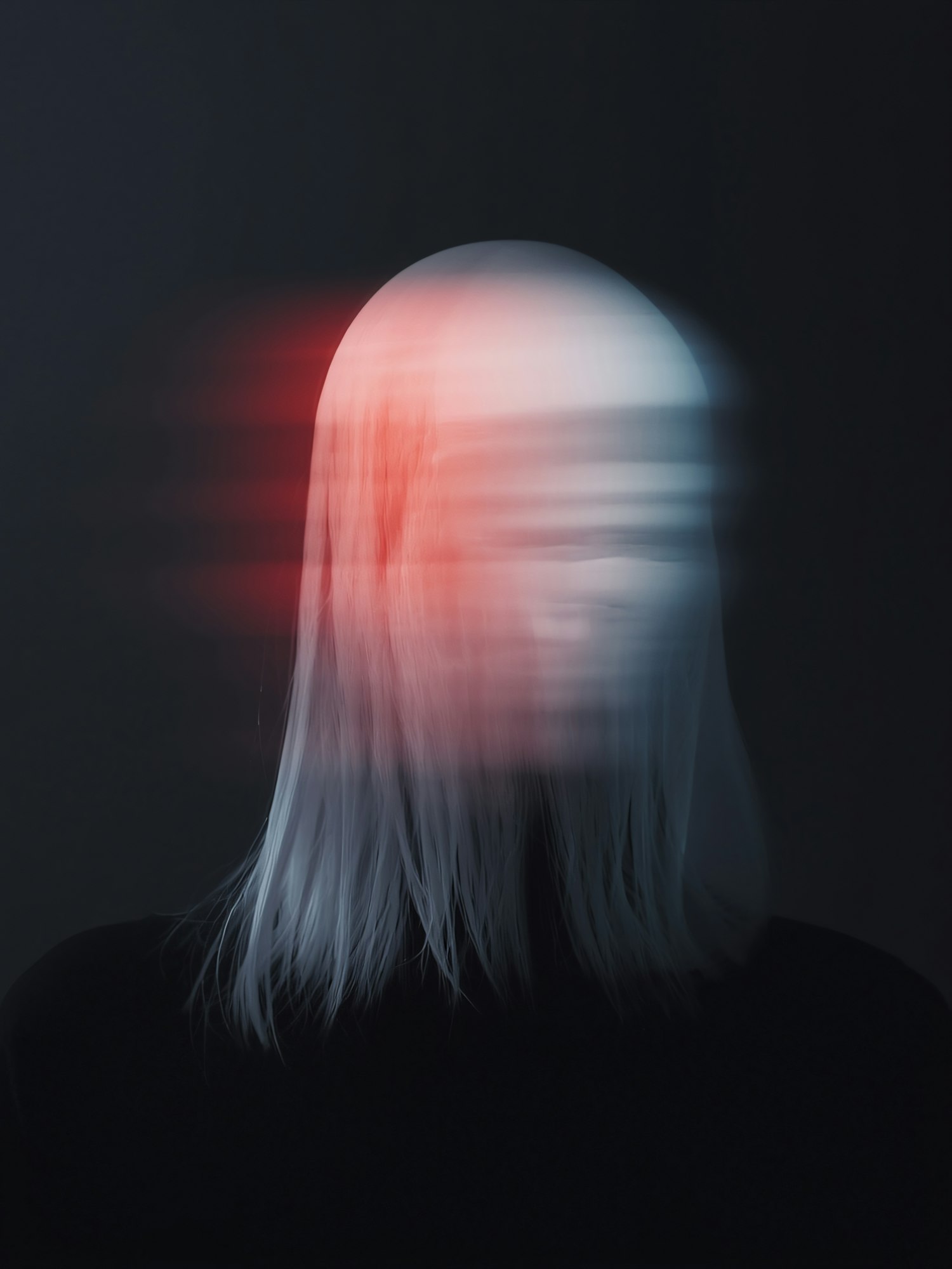 A surreal image of a person with white hair, their face blurred with motion, and a red light accentuating the dark, abstract scene.