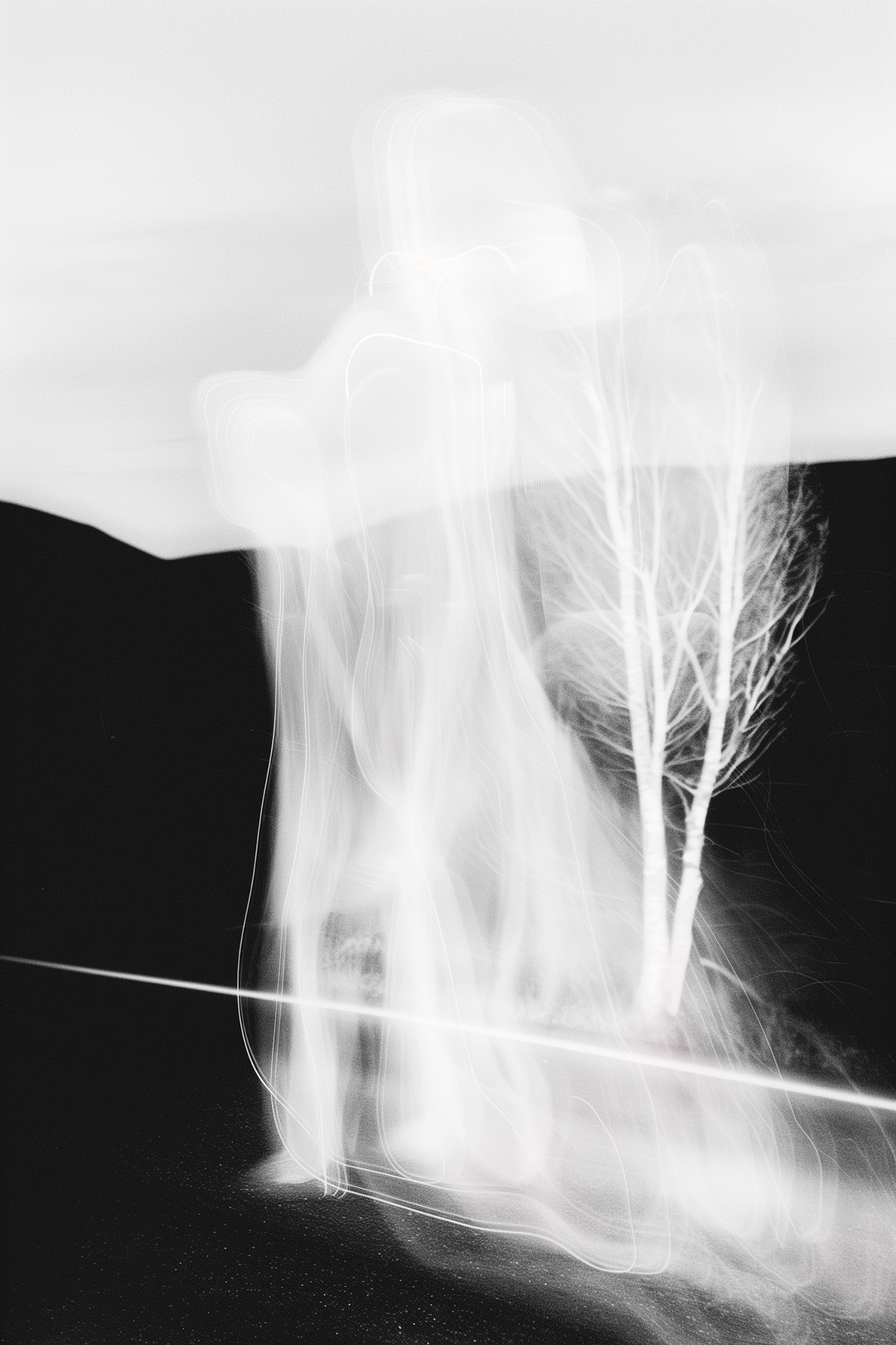 Ethereal black-and-white abstract art with ghostly streaks and bare trees, creating a surreal and mysterious atmosphere.