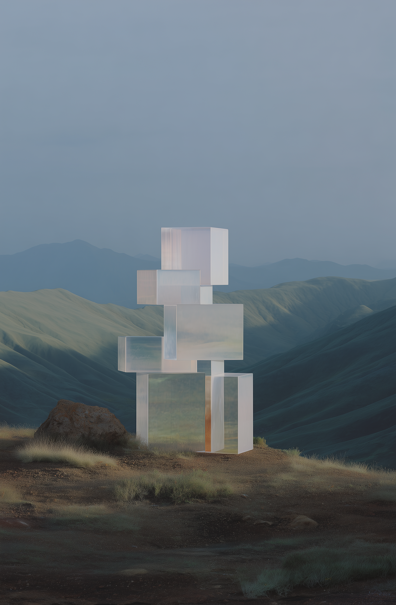 A stack of translucent cubes in a serene mountain landscape, blending modern design with nature's beauty under a soft, overcast sky.