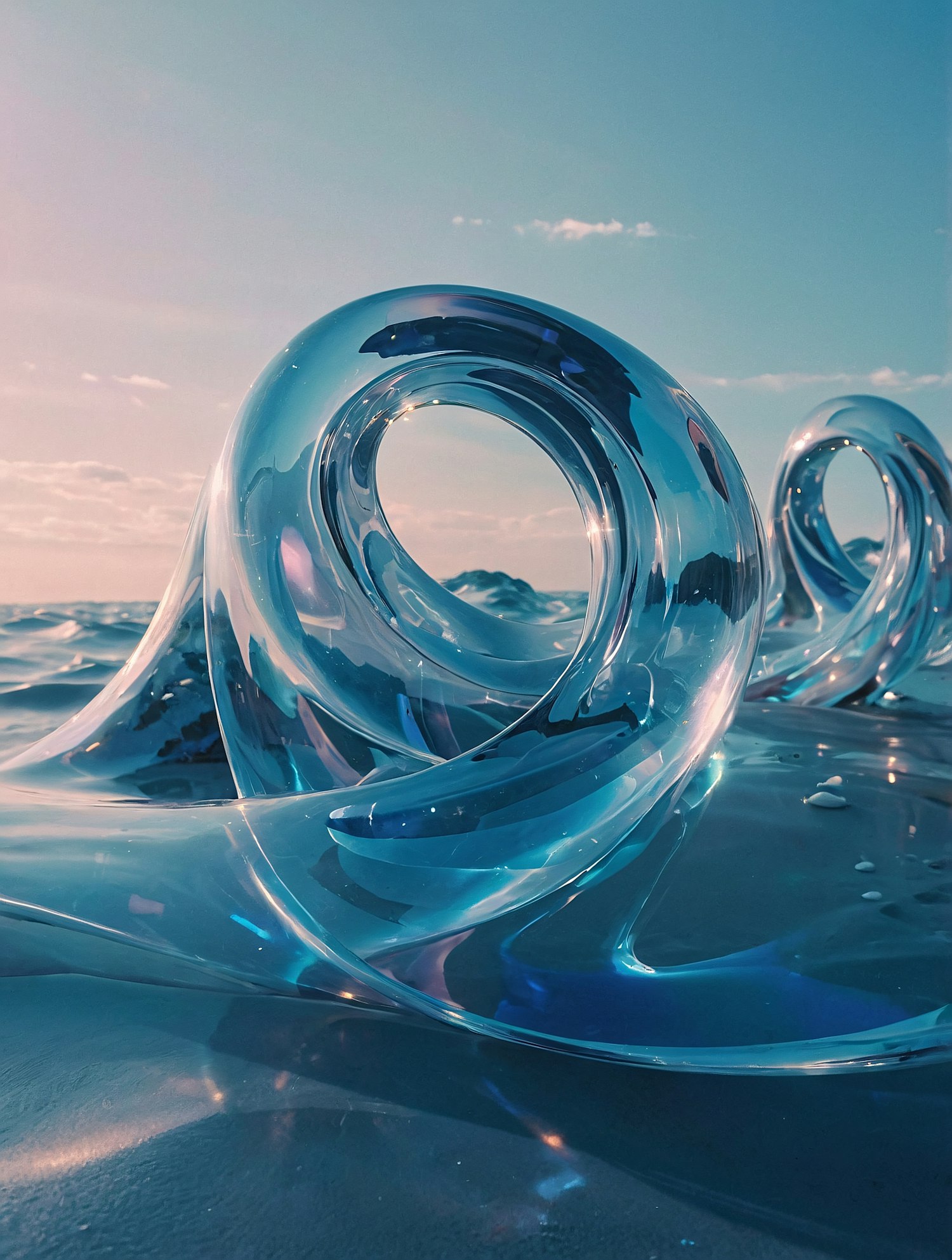 Surreal glass-like loops on a reflective surface under a serene blue sky, blending light and shadow for a dreamlike, artistic vibe.