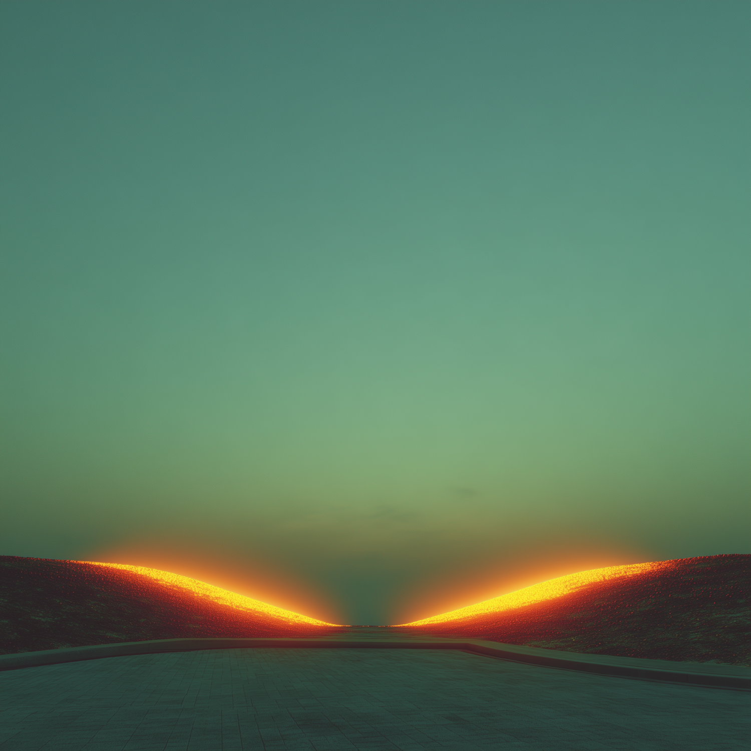 Surreal glowing hills under a green sky, with a paved path leading into the horizon. A dreamlike and tranquil landscape.