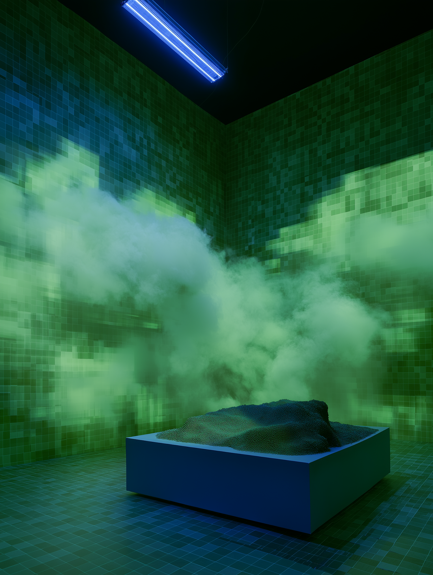 A surreal green-tiled room with a glowing blue light, misty atmosphere, and a textured platform centerpiece.