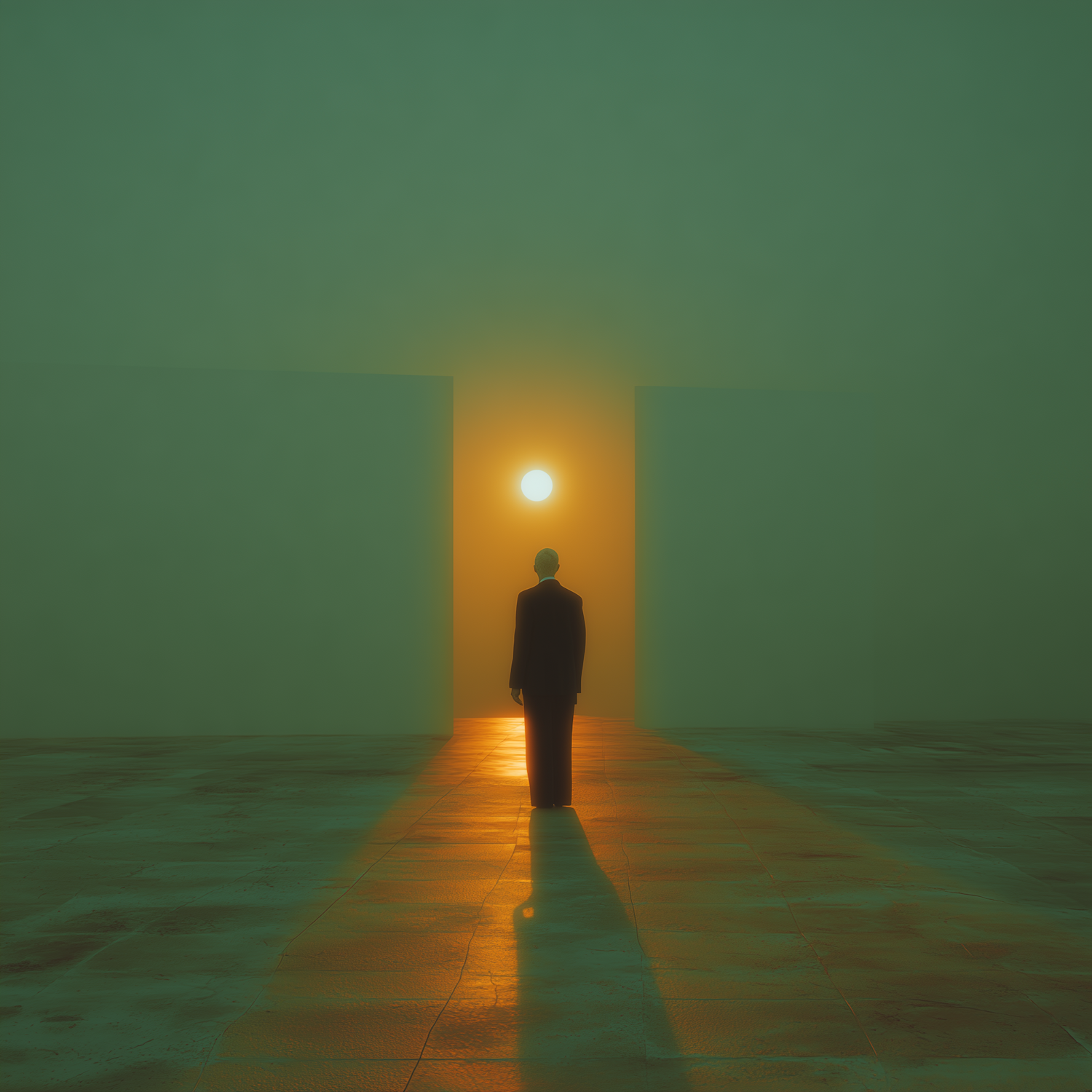 A lone figure in a dark suit stands before a glowing orange light in a surreal green-hued space, evoking a dreamlike atmosphere.