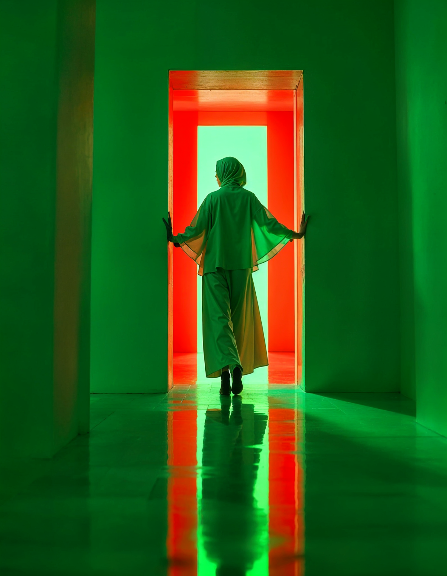 A person in green attire stands in a glowing red doorway, surrounded by vibrant green walls and reflections on a polished floor.