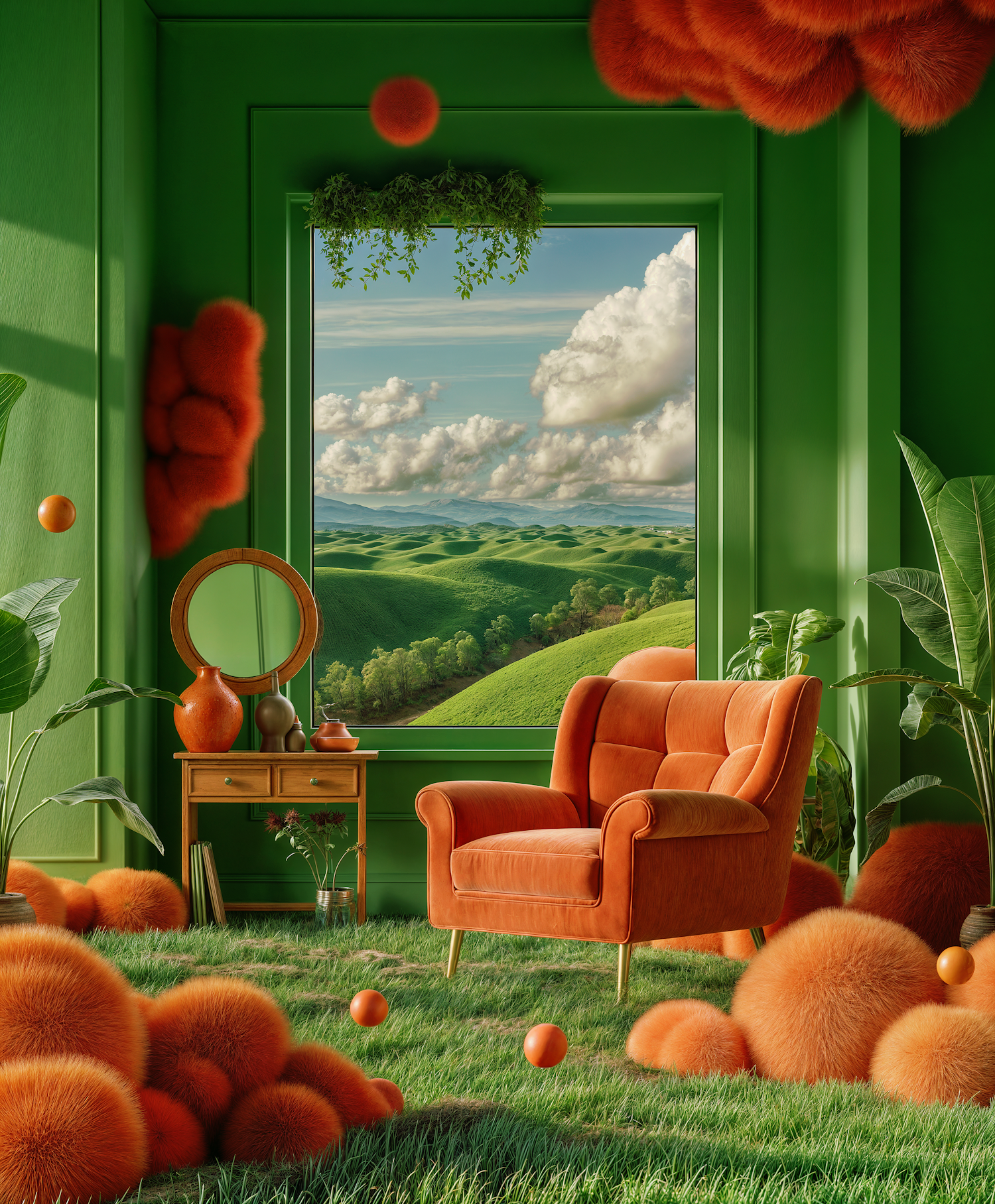 Vibrant room with green walls, orange armchair, fluffy spheres, and a scenic view of rolling hills through a large window.