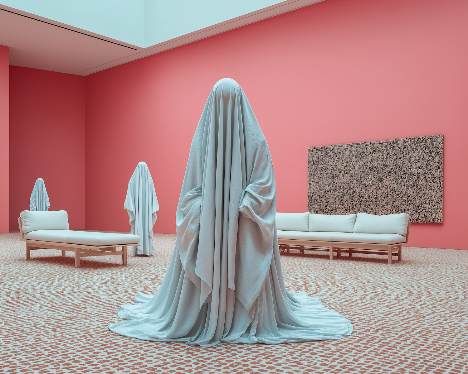 A surreal room with coral walls, modern furniture, and ghostly figures draped in light blue fabric, creating a mysterious atmosphere.