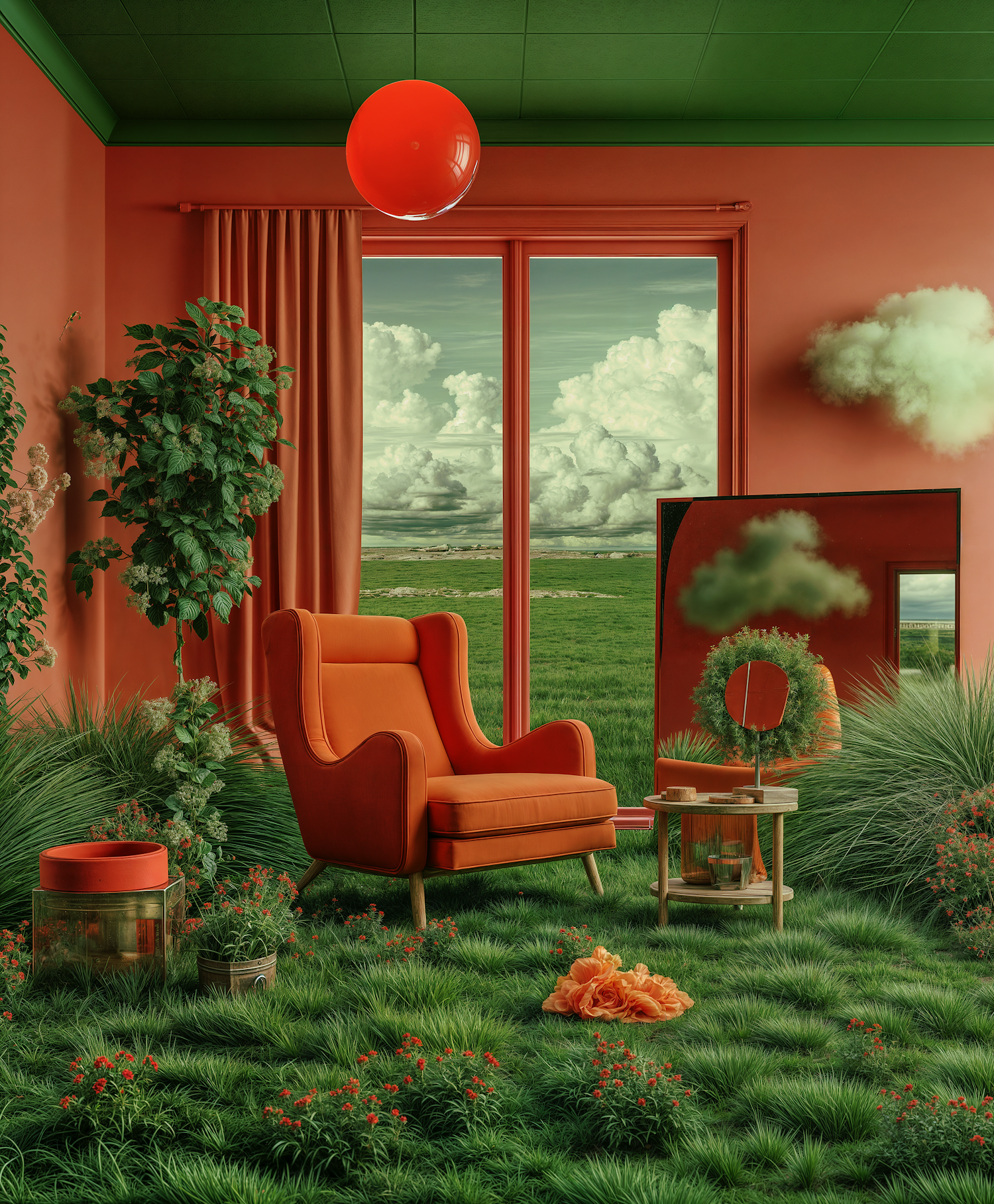 Surreal room with orange decor, grass floor, and a view of green fields. Features an orange armchair, plants, and a large window.