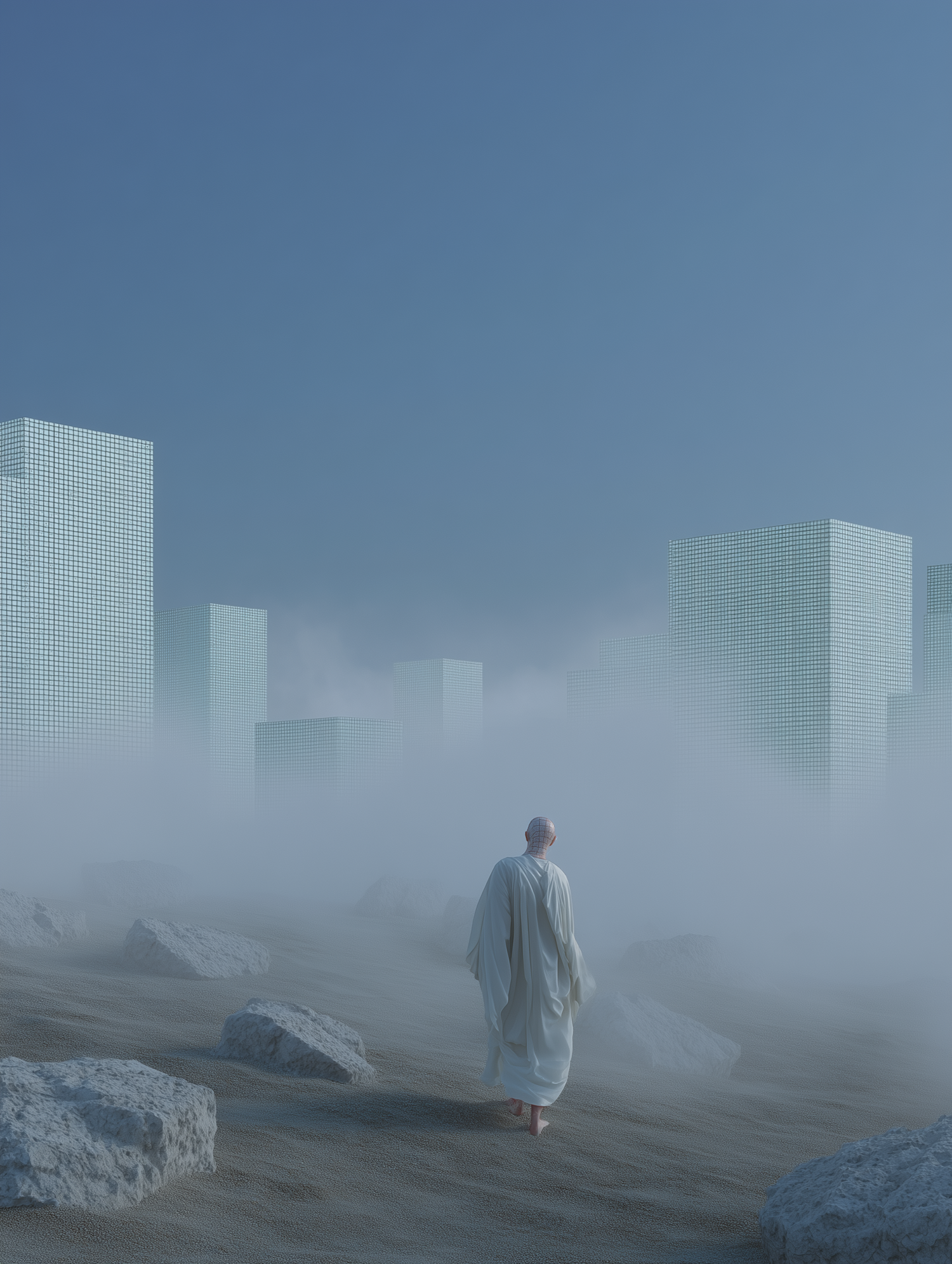 A serene, surreal scene of a robed figure walking through misty terrain with futuristic grid-like towers in the background.