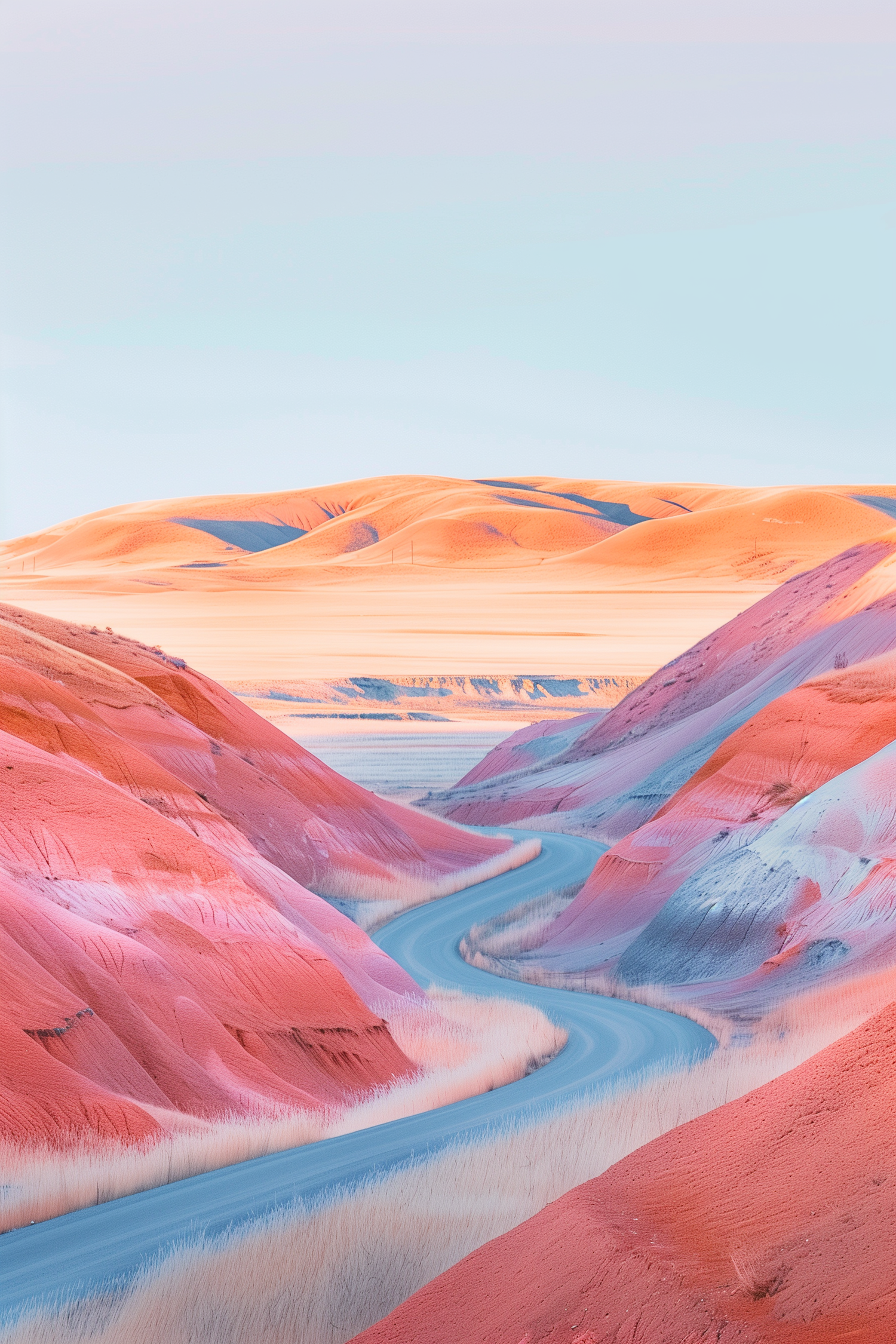 Surreal landscape with pink and orange hills and a winding blue road under a soft blue sky, creating a dreamlike atmosphere.