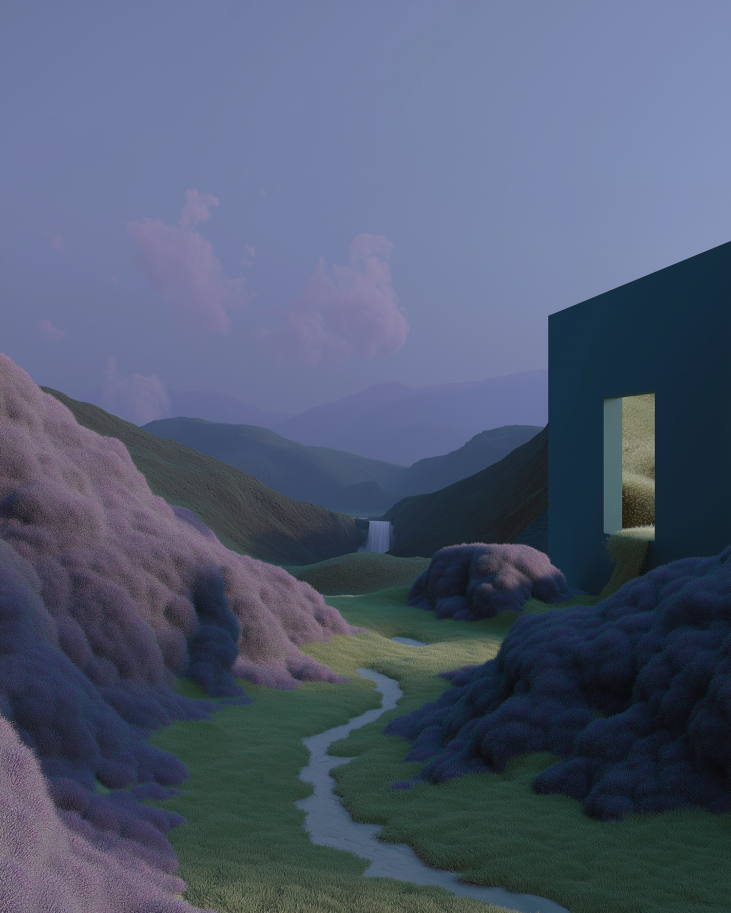 Surreal landscape with purple hills, a winding stream, and a glowing geometric structure under a soft blue sky.